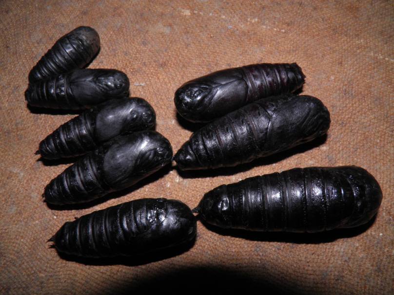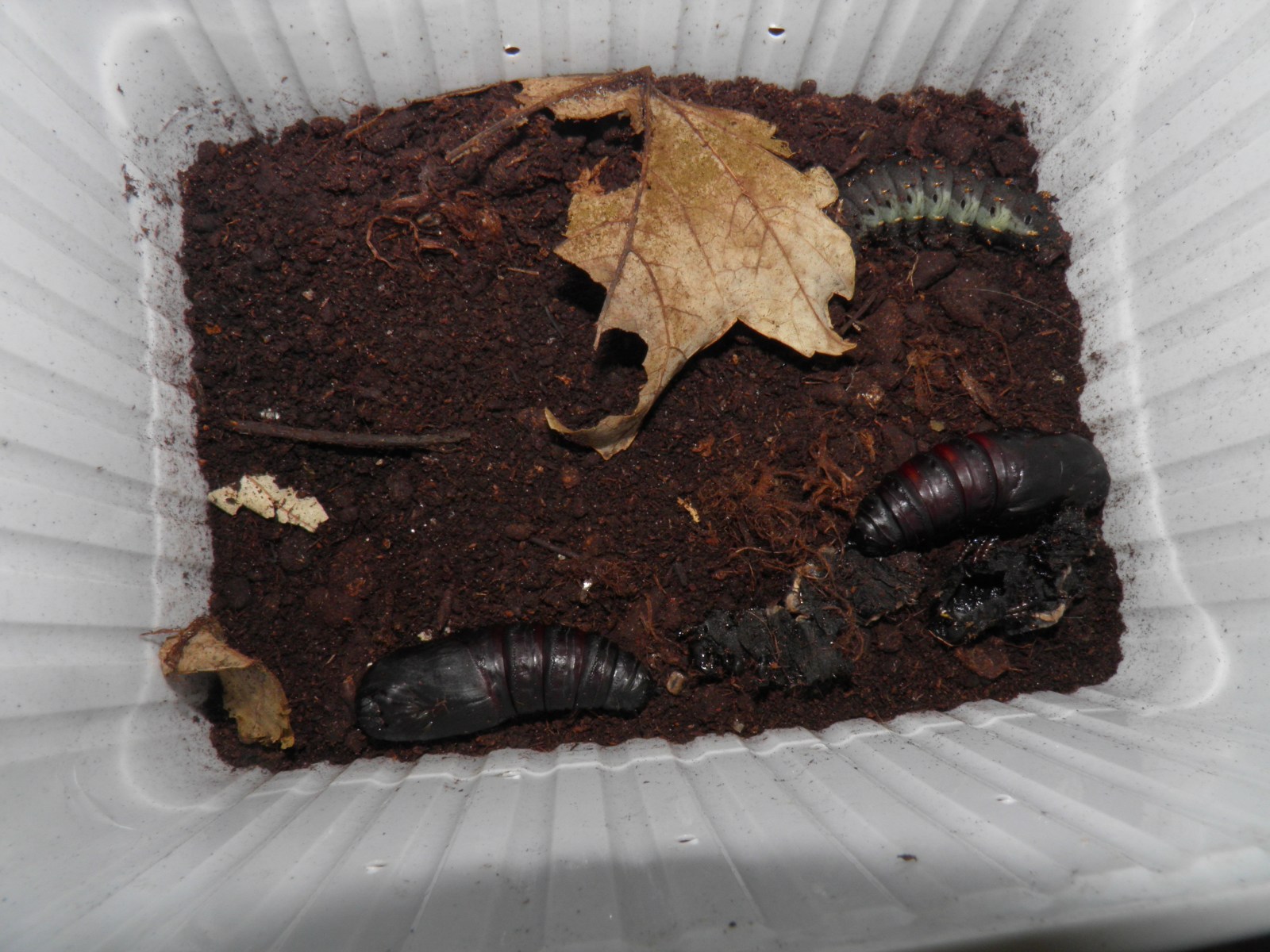 The caterpillars will be grown in 1.5 to 2 months depending on the temperature and food quality. From that point they will descend to the floor from their host plants, and look for a place to pupate. This species pupates in moist soil or other substrate. In the wild, they burrow in the soil or find crevices to crawl into and pupate. Underground they are protected from the elements and can resist dry and colder conditions. In captivity they can be provided bird sand, vermiculite – or simply earth/soil.