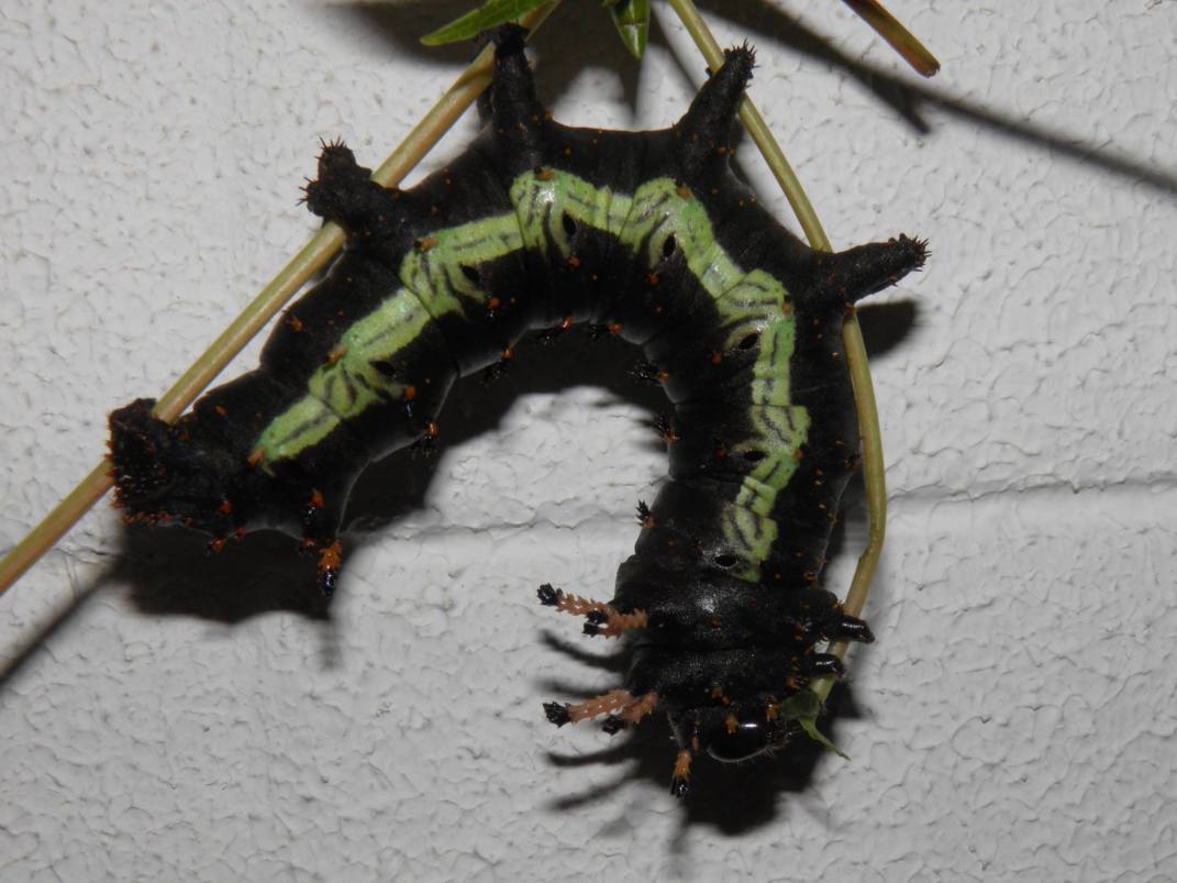 The eggs of Citheronia beledonon are transparent, oval and yellowish. After hatching, the small caterpillars that are about 8mm-10mm in size will quickly find a place to feed from the leaves of their respective host plants. They thrive on Schinus, Liquidambar or Juglans. The first instar is black with an orange patch below the thorax. They are adorned with horn-like setae – especially their thoracical horns are elongated. The caterpillars are solitary.