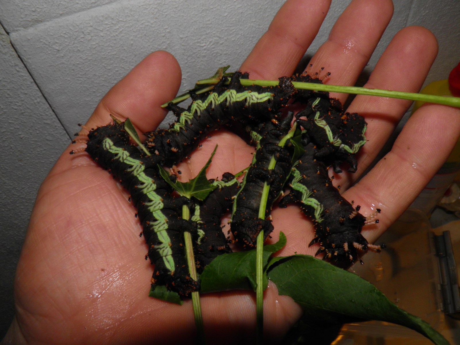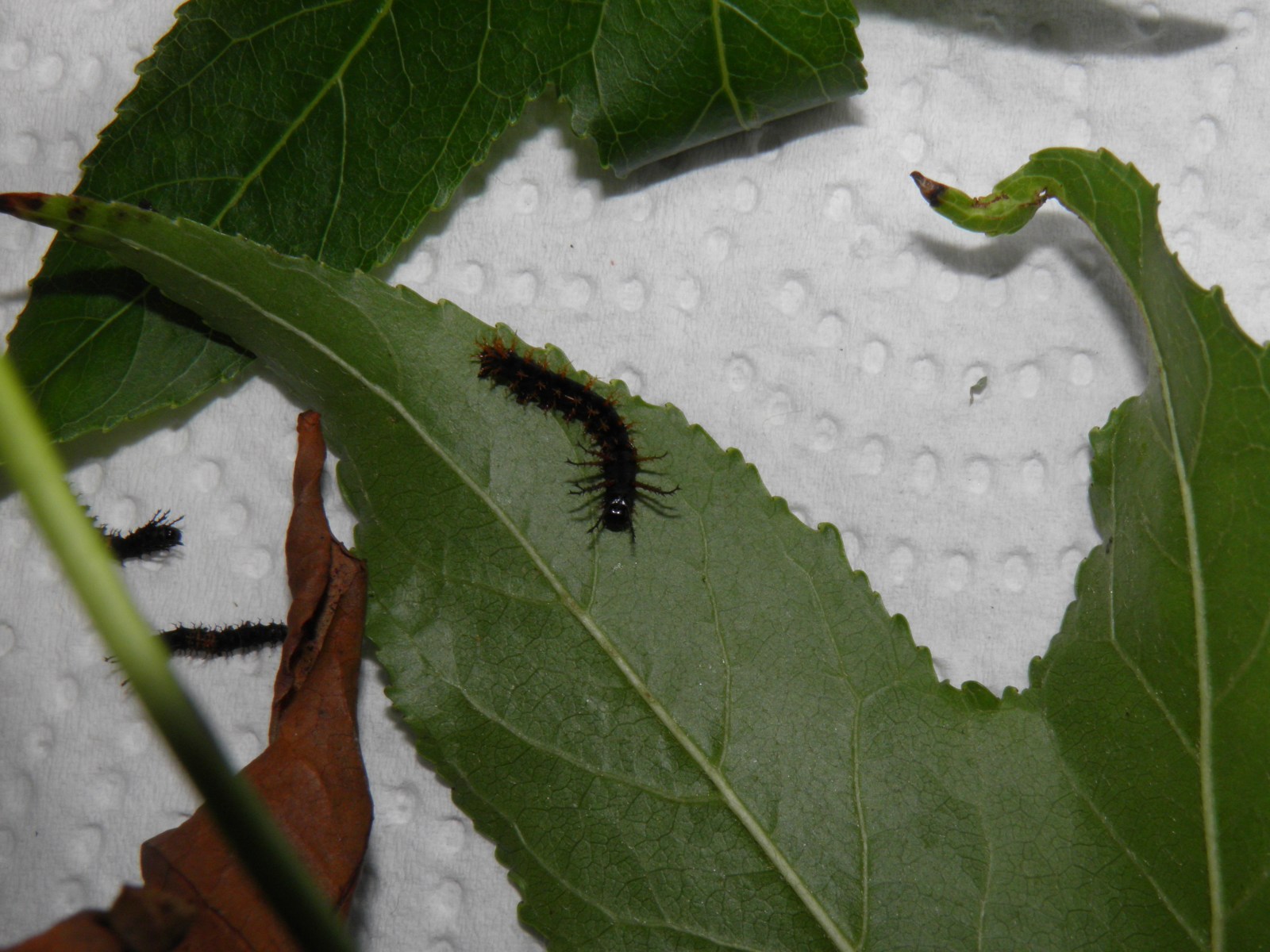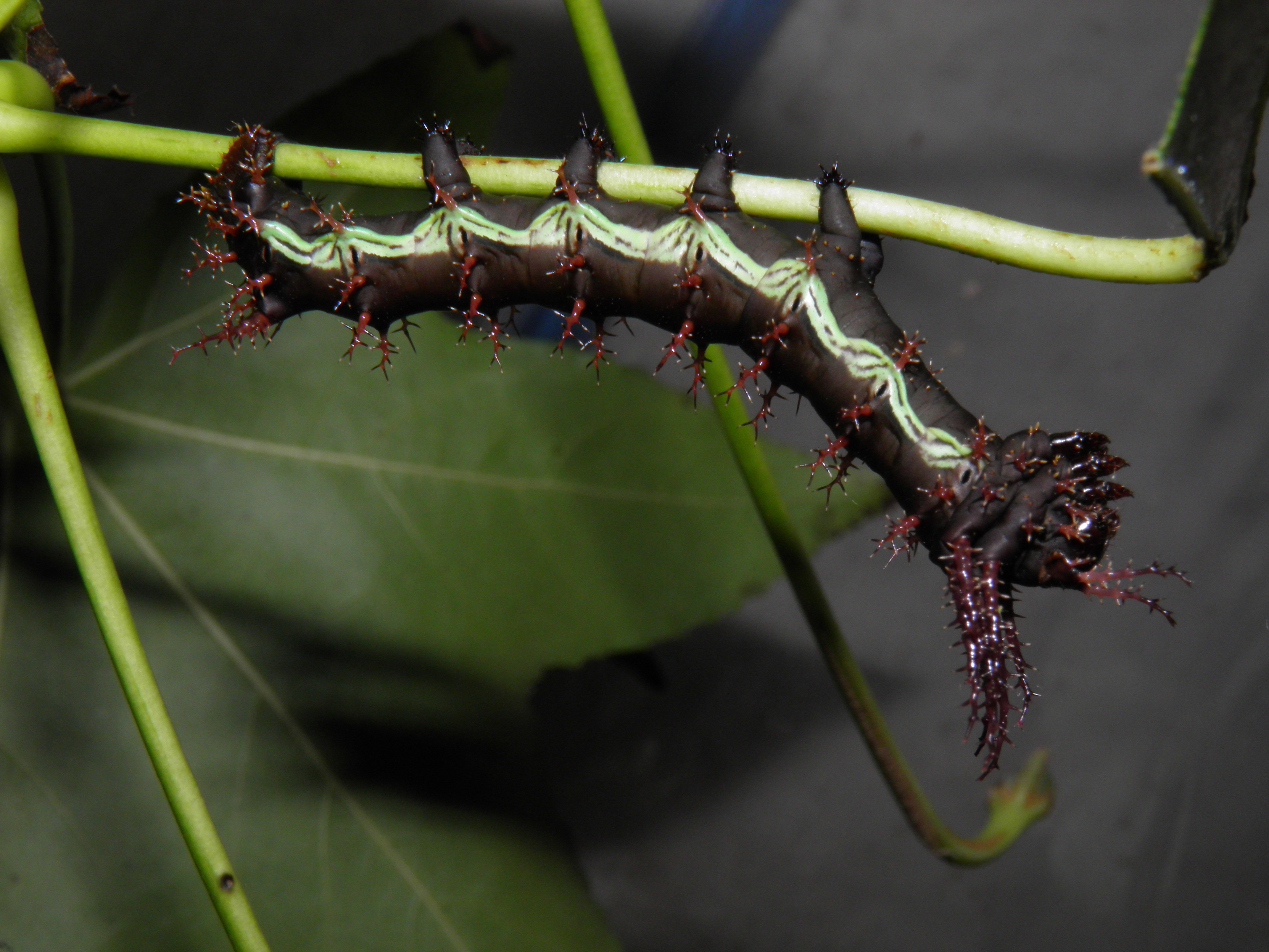 The first two instars can be given plastic boxes with leaves of their respective host plant as container. However, from the third instar and beyond they need fresh air and ventilation. It is best to raise the third to fifth instar in cages or in boxes with the lid removed, or in rearing sleeves. Avoid excess humidity. They do like it warm. The third instar is brown with large red spikes.