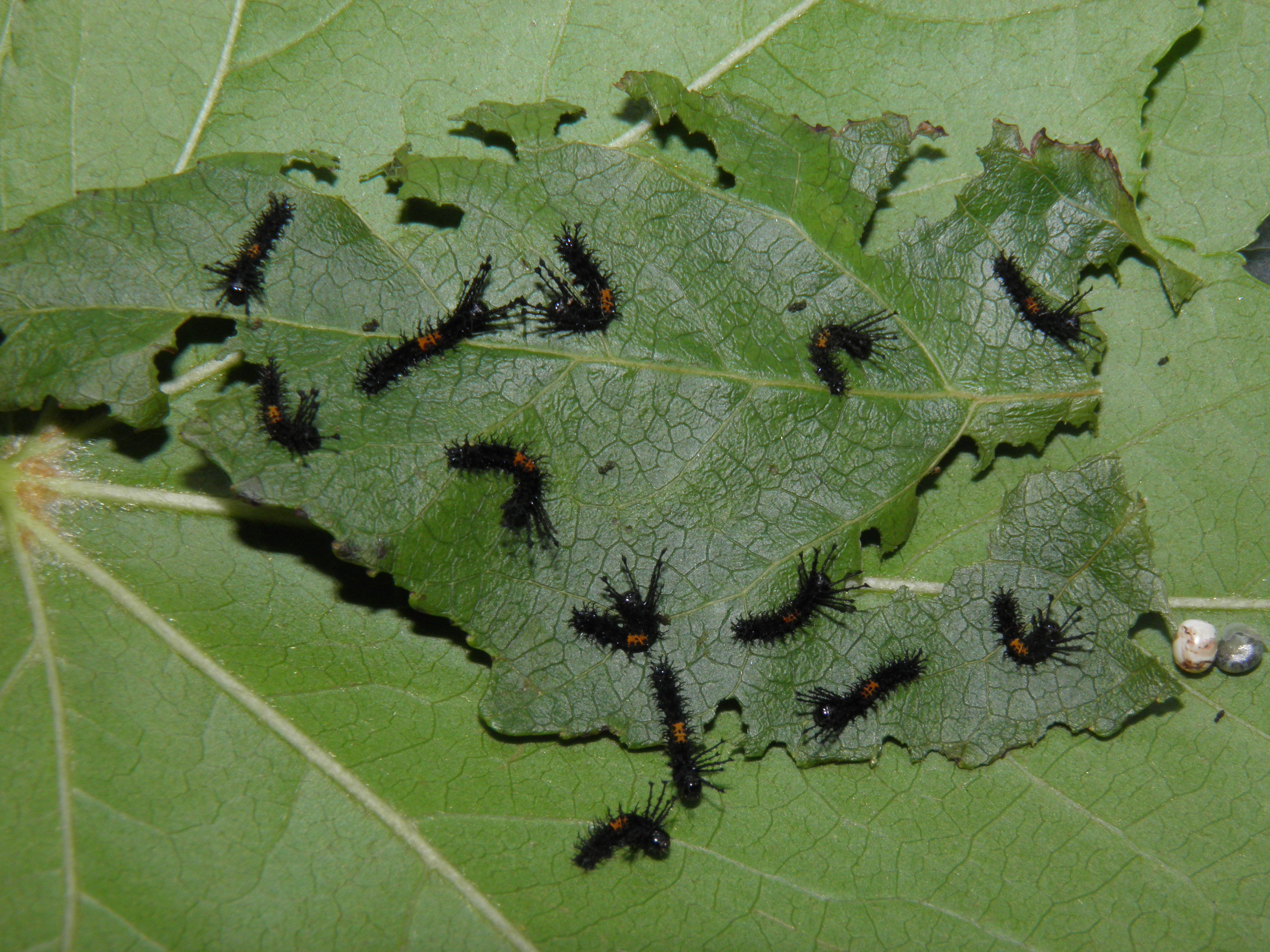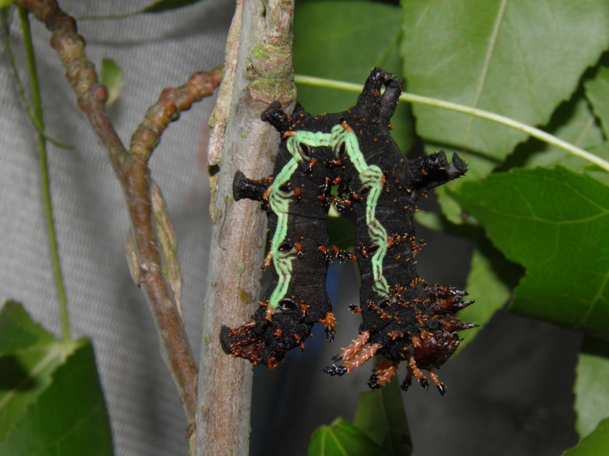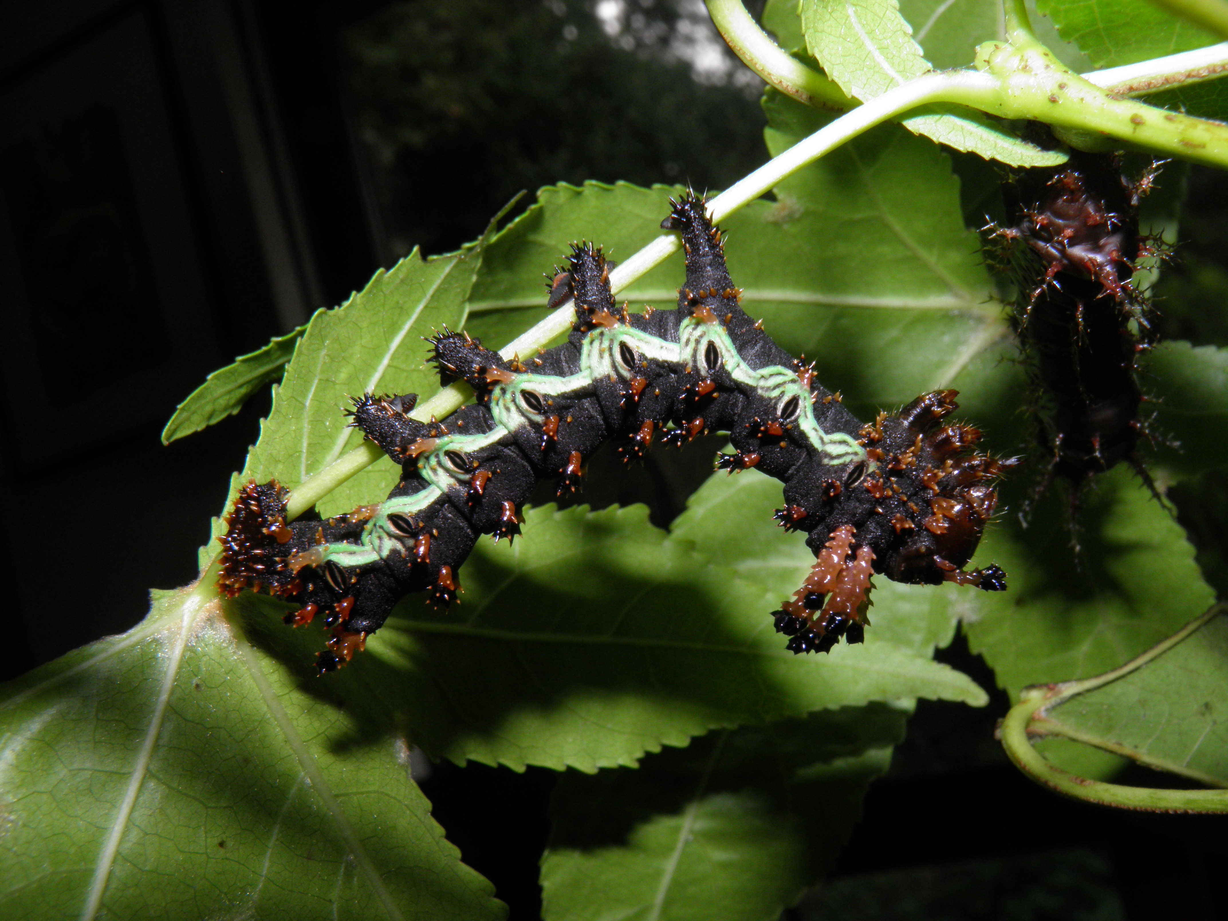 The first two instars can be given plastic boxes with leaves of their respective host plant as container. However, from the third instar and beyond they need fresh air and ventilation. It is best to raise the third to fifth instar in cages or in boxes with the lid removed, or in rearing sleeves. Avoid excess humidity. They do like it warm. The third instar is brown with large red spikes.
