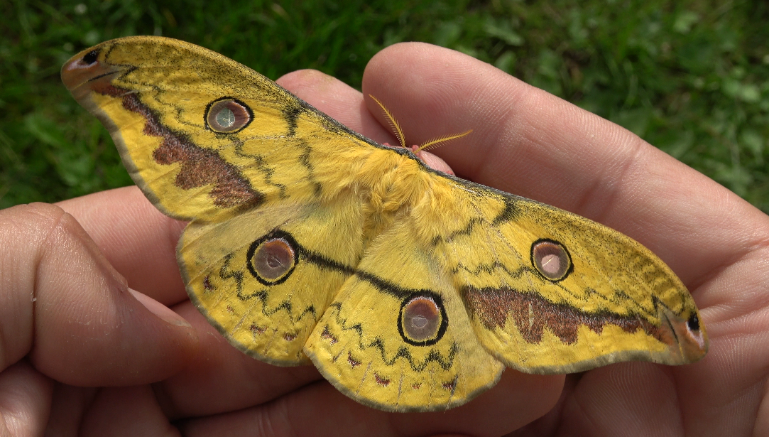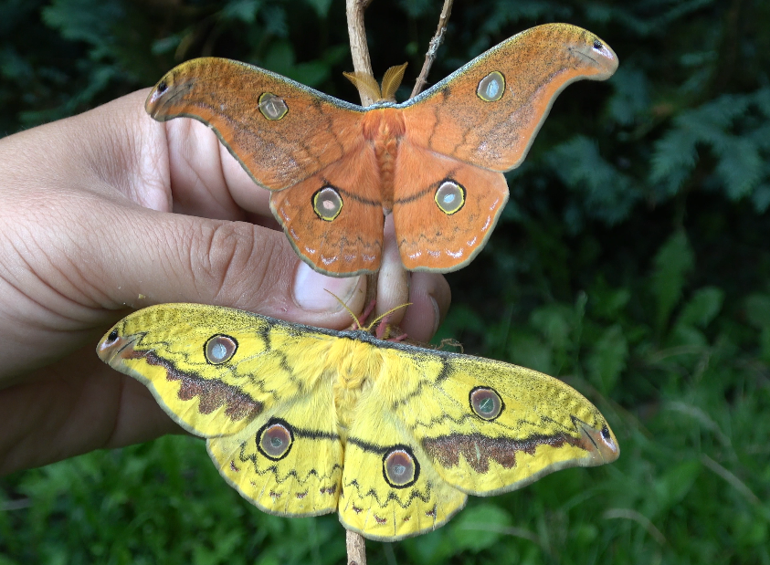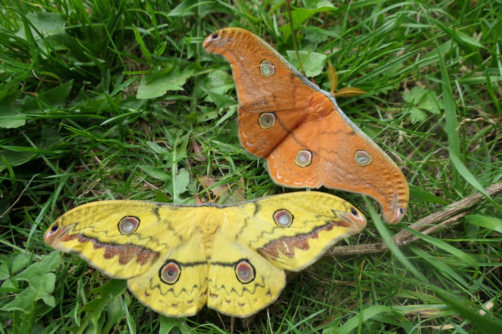 Once their development is completed, incredibly beautiful moths emerge from their cocoons. The males are bright orange, with stunning pastel colored eyespots. Females are yellow, with brown markings. These beautiful, ephemeral and lutescent animals only live for 7 to 14 days. In captivity, males and females mate rather easily and quickly; if left in a medium sized mesh (pop-up) cage with airflow.