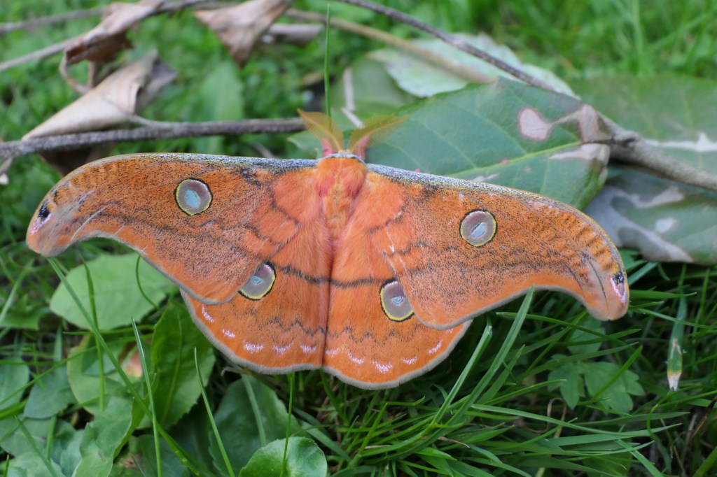 This medium size silkmoth is very colorful; it seems to have bright orange males and yellow-brown females.