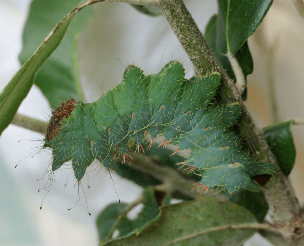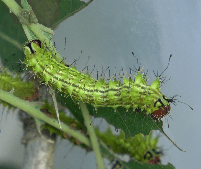 The third, fourth, and fifth live stages can be kept in large plastic boxes provided there is a adequate ventilation, moderate humidity, and a moderate density of larvae. They can be reared on plant cuttings (Quercus sp). The third life stage is lime green with milky white stripes; the fourth life stage is yellowish to lime green with white spiracles, turquoise tubercules with red spines.