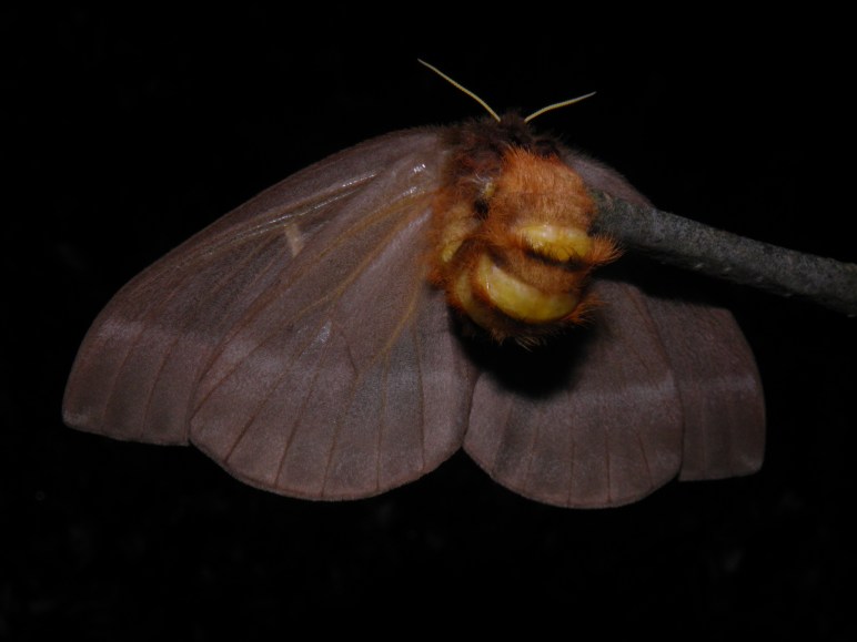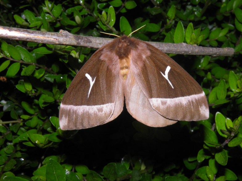 Not much is known about the Saturniidae moth Dirphia brevifurca. It is found in Peru, Ecuador and Bolivia where it feeds on a broad range of plants – the caterpillars are polyphagous. Males have bright orange hindwings, a whiteish border around their forewings and two white ‘hieroglyphic’ markings. Females are larger, more dark and have reduced white scaling, but are shown to have the same type of markings.