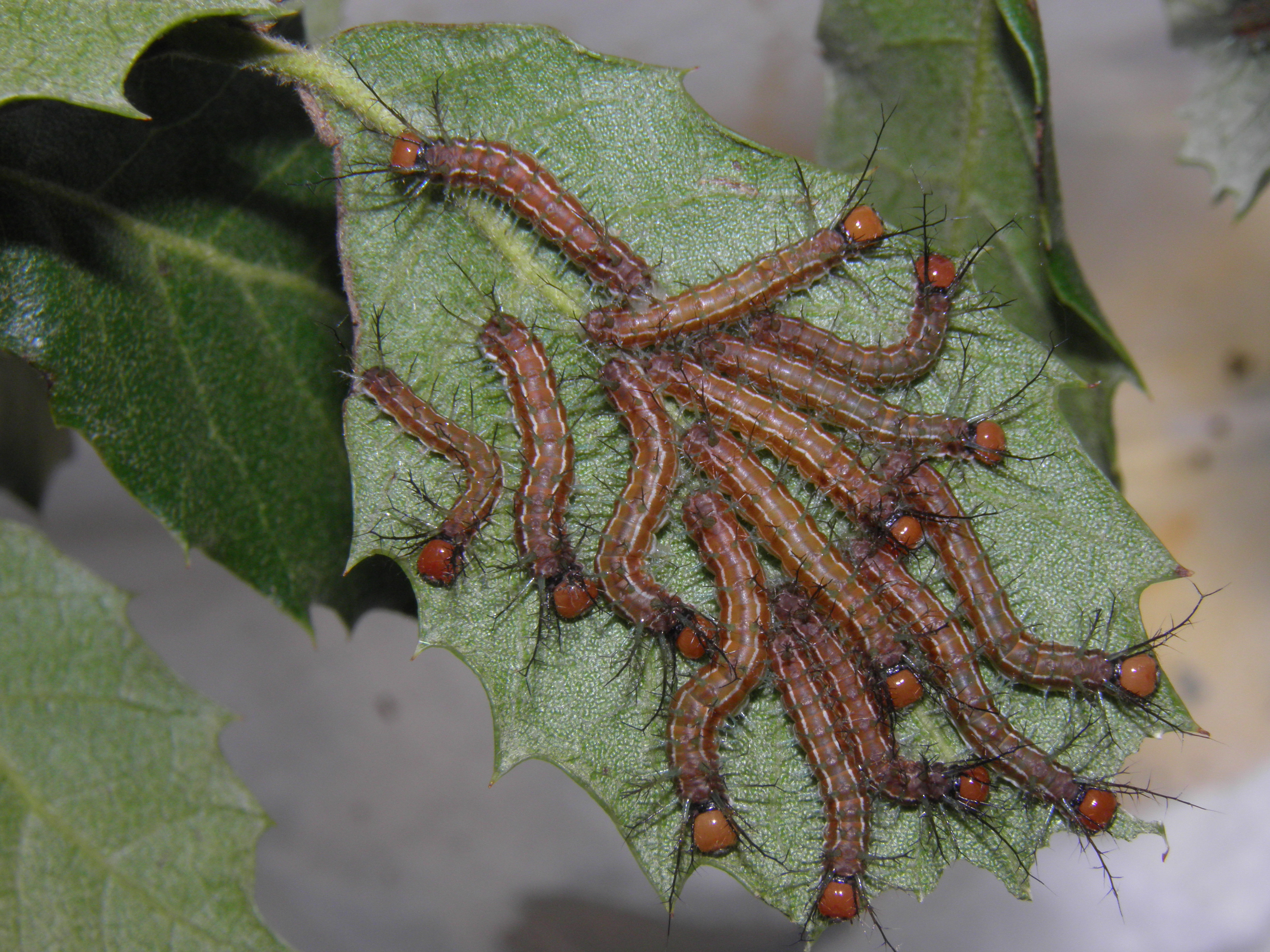 The young instars of Dirphia brevifurca are brown, with orange head capsules. During the earliest stages of their life, they are gregarious: they feed, travel and shed skins together. They accept a broad diversity of host plants, upon which they are mainly found feeding from the underside of the leaves in small groups. The youngest life stages can easily be raised in plastic containers; this species seems to tolerate a lack of ventilation and excessive humidity very well.