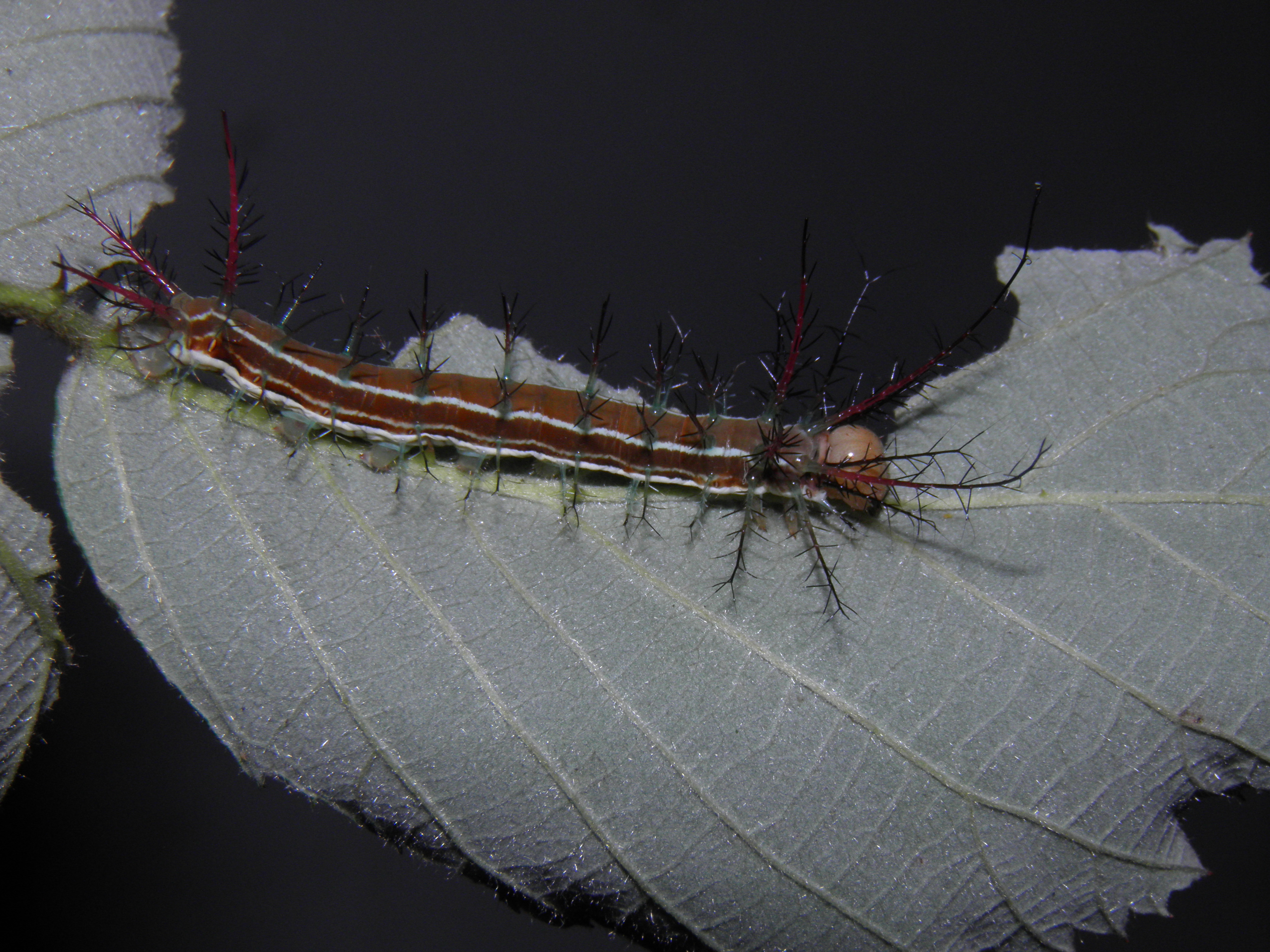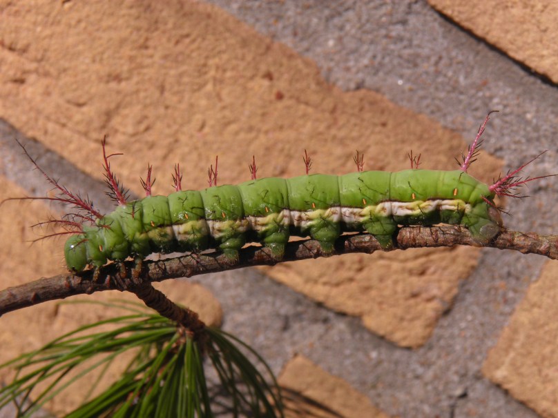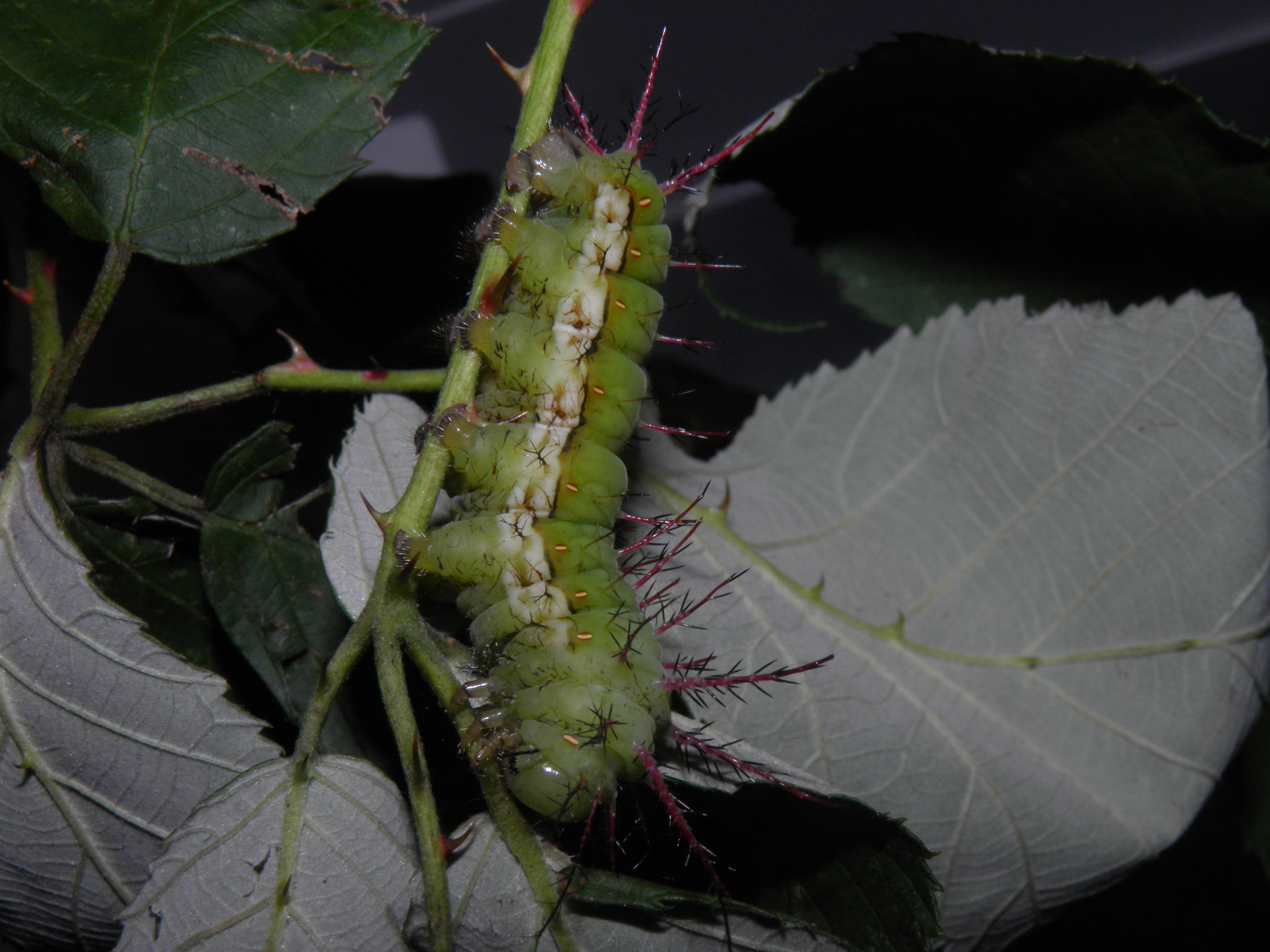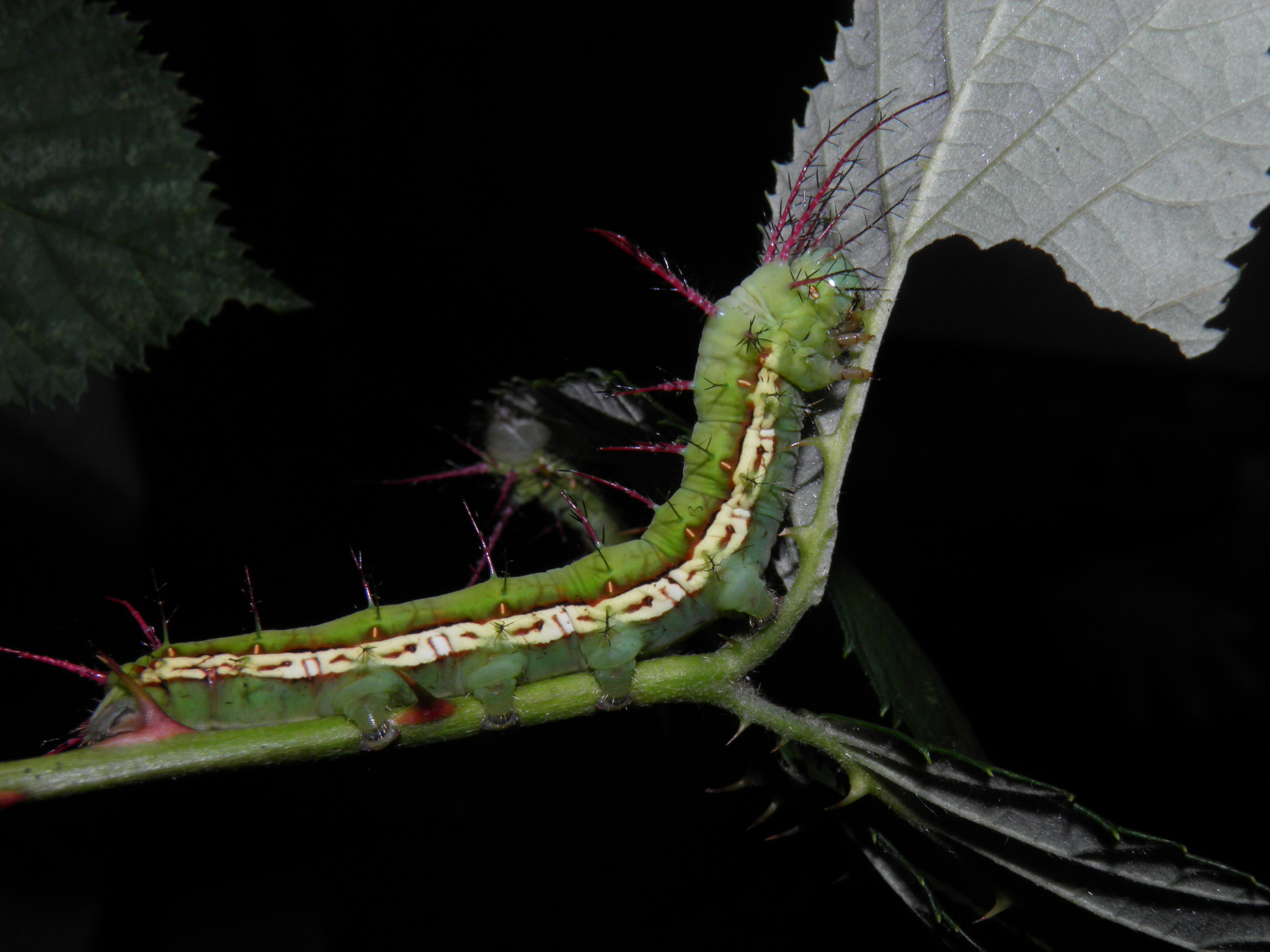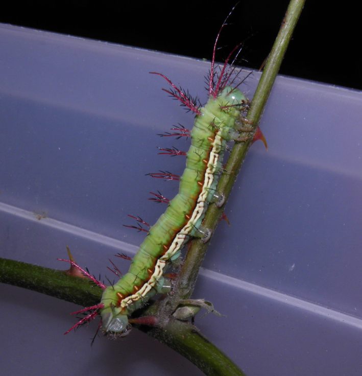 This Dirphia species has six instars.While the first four are rather brown, the fifth and six instar are light green with bright red spines and a white stripe running along the side of their bodies.