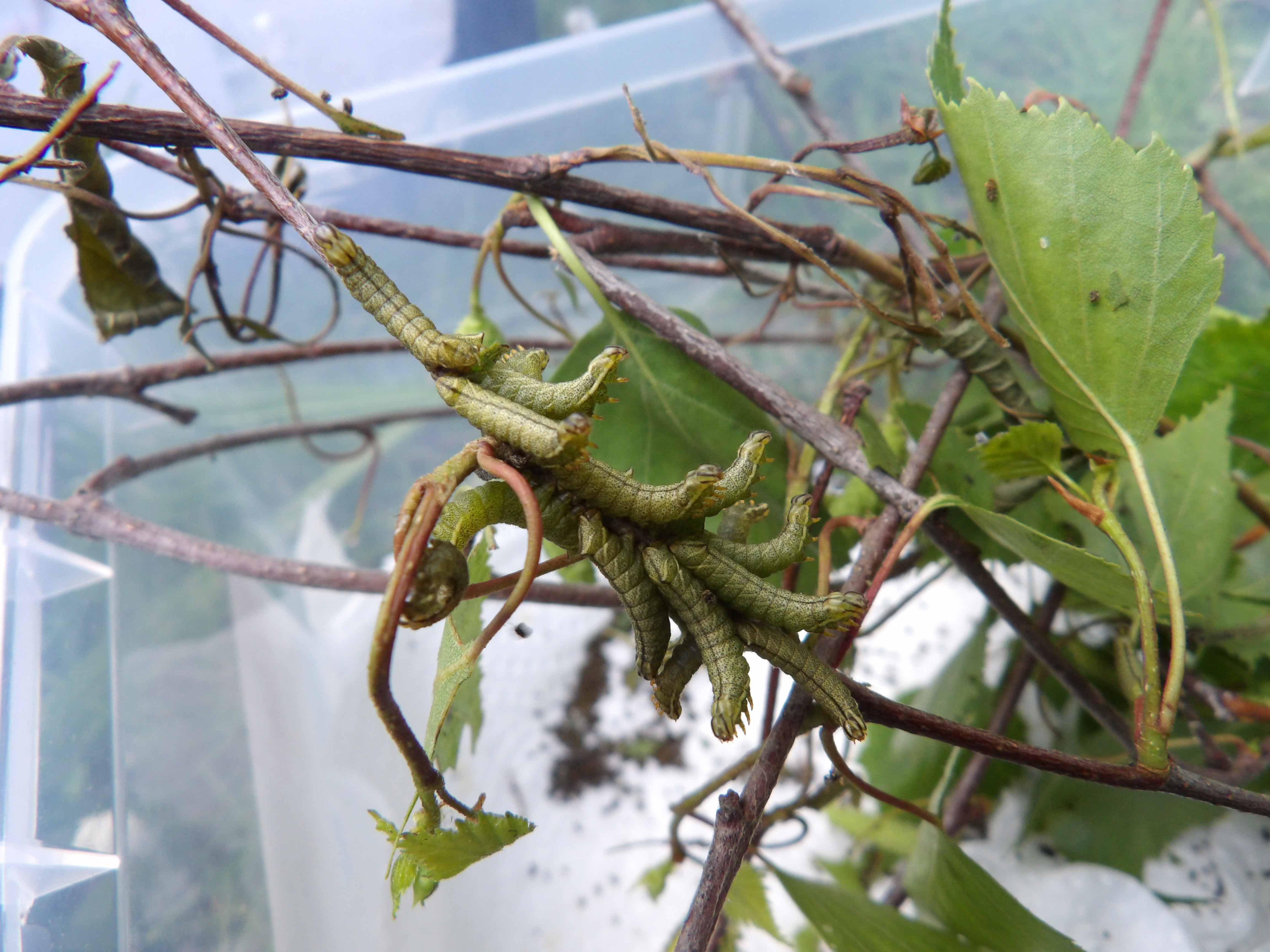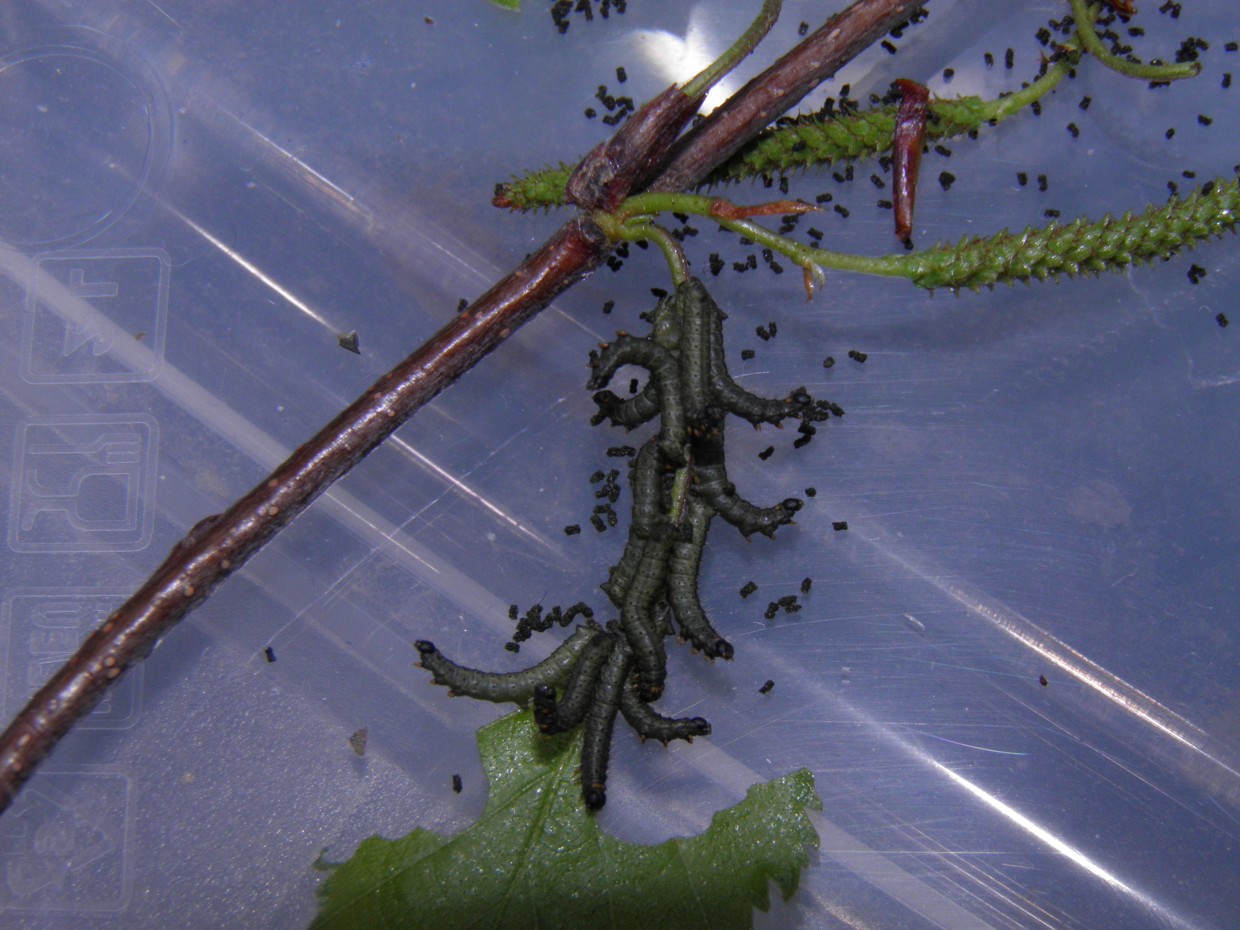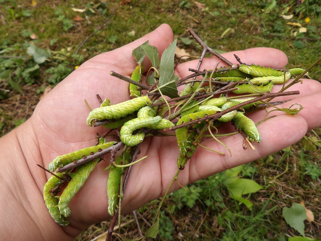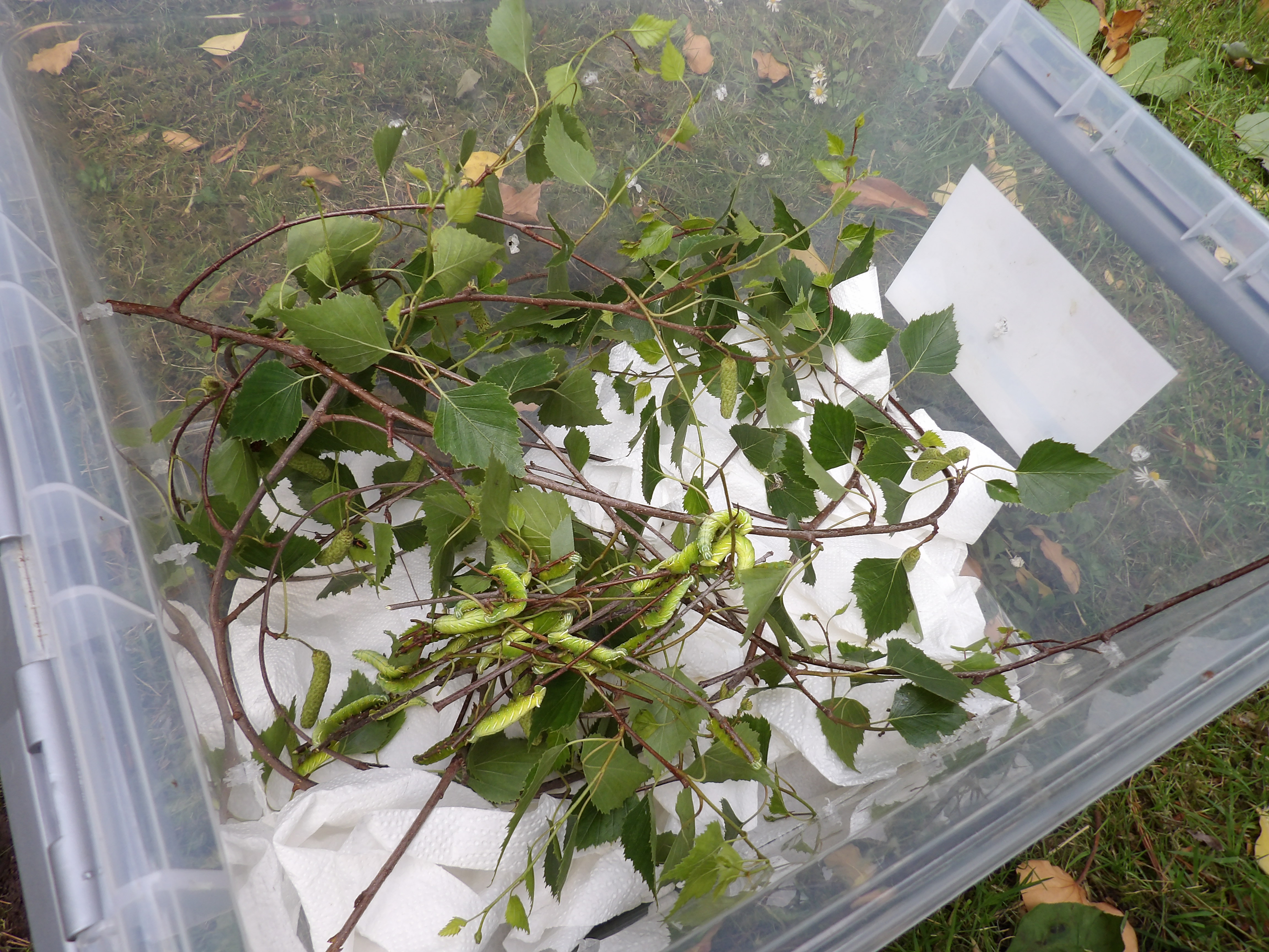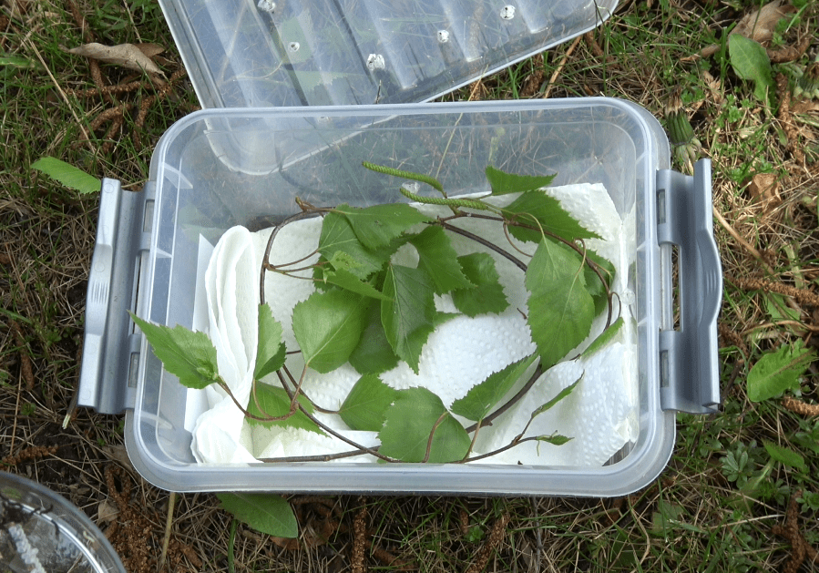 If you choose to rear them in plastic boxes; cover the bottom of the container with a thick layer of paper towels, and create small ventilation holes in the container so that excessive moisture can escape. Then, give them fresh birch (Betula) branches. Replace the branches every 2-3 days (birch tree can dry out fast). The L1 and L2 can be reared in relatively small plastic storage containers (20cm x 10cm x 10cm will do). – Then, after the 3rd instar (L3), transfer them to much larger boxes (I often pick a specific brand of 58cm x 44cn x 31 cm boxes that I buy online). After L3, a little bit of airflow and/or ventilation becomes important. While the first instars tolerate higher humidity, the L3 and L4 don’t like overly ‘stuffy’ conditions. Cut one or several large holes in the rearing container (a few 10cmx10cm holes will do) and cover the hole with mosquito netting or mesh. The plastic box and moisture the host plant releases over time will create a naturally humid environment, but some airflow/ventilation prevents condensation, and inhibits bacterial growth (wet conditions can make larvae sick).