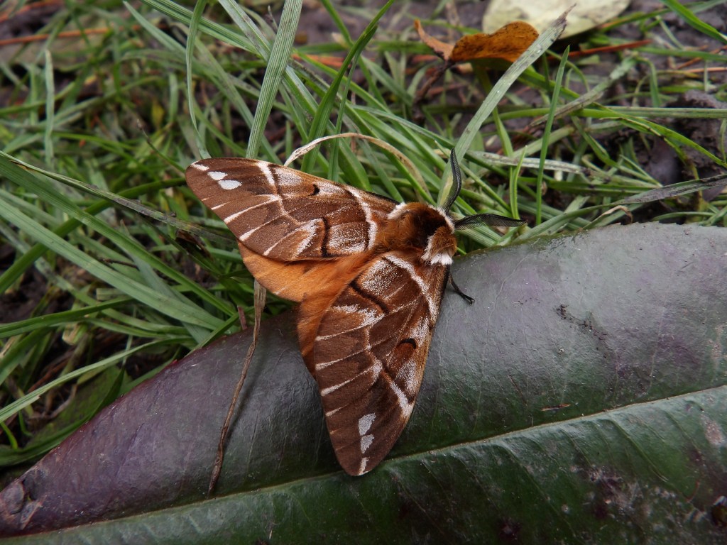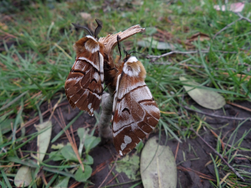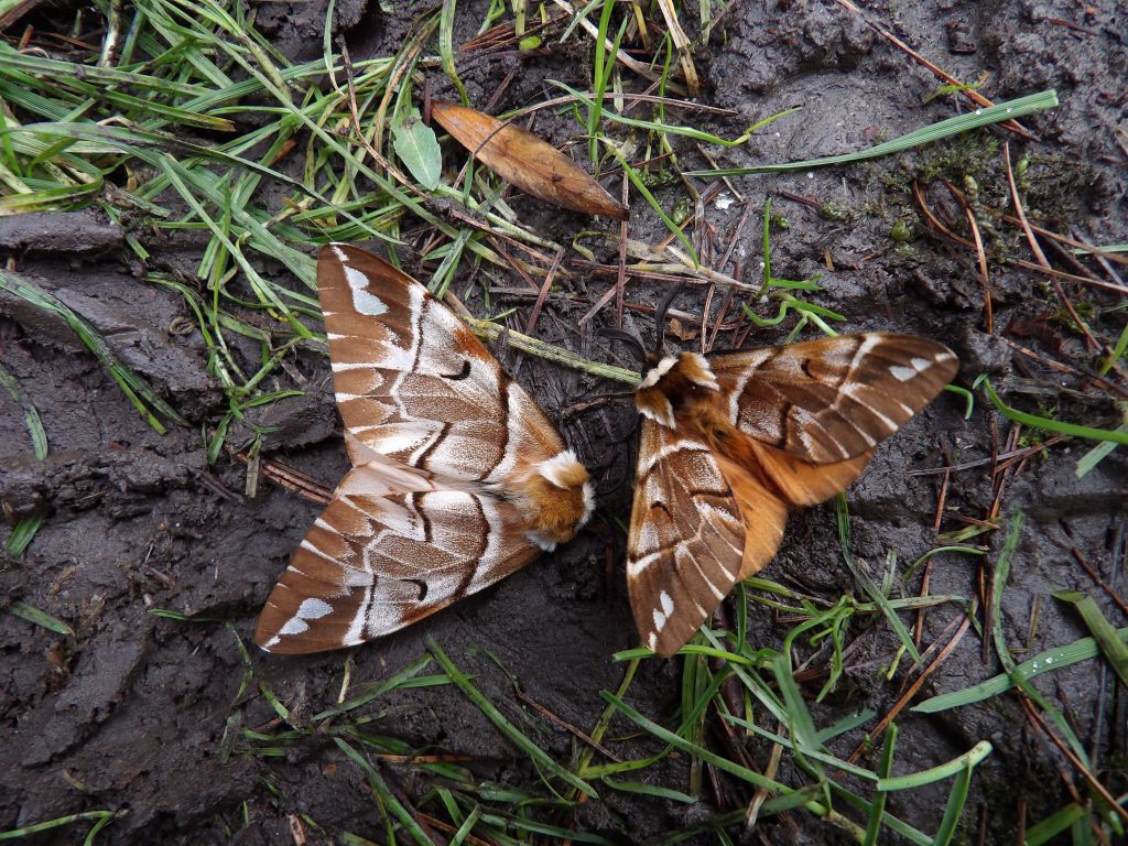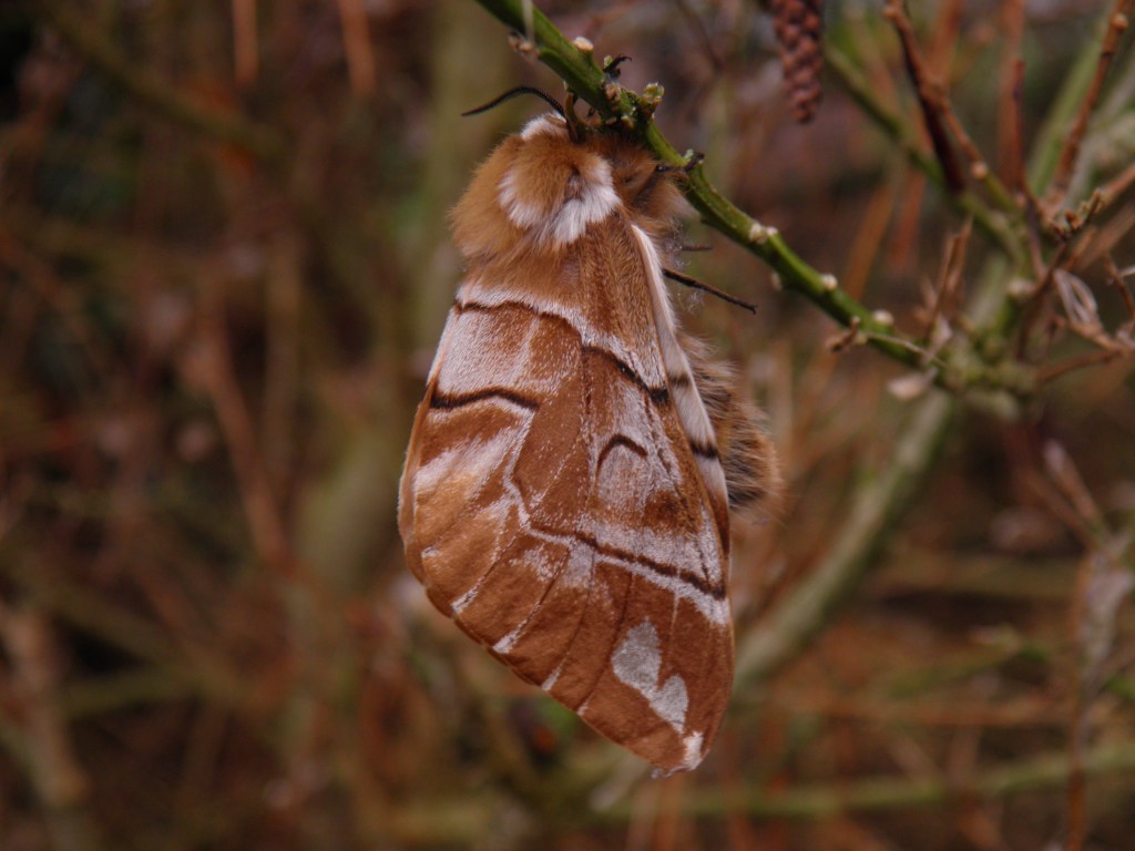 The moths are rather large (by European moth- standards that is) and really beautiful in their own way. The rich brown, white and orange markings make them look like artisan, flying, and rather artistically designed cinnamon buns. Males tend to be darker orange while females are often much more pale and have more creamy white frosting. There is a strong sexual dimorphism, with females often being atleast twice the size of males. The males are diurnal, and they often fly in the afternoon or dusk, looking for females. Females appear to be more passive at first, mainly sitting still and waiting for a male to locate her. However, after mating has taken place, females do make short flights (at night, they are nocturnal unlike the males!) to find a suitable spot to deposit her eggs, typically on the branches of birch trees. The eggs can hatch in as little as 2 weeks (14 days) but their development is significantly prolonged by cold temperatures, as much as over a month (33 days+) in some cases. This allows the moths to be active very early in spring, even before the host plants have grown leaf buds in some cases, and ensures that the hatching of the eggs coincides with the trees growing leaves. Some suggest the eggs can also use chemical cues to detect leaves of the host plant budding.