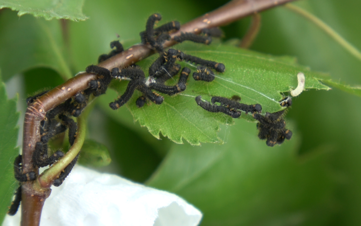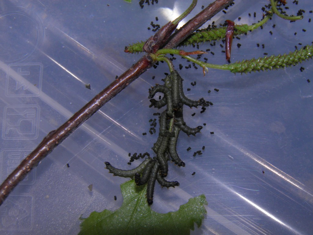 The first instar of Endromis versicolora appears to be plain black. As they begin to feed, they become more grey-ish and round; the second instar is a dark grey-ish green shade. Make sure the rearing sleeve is free of certain pests – such as aphids that produce mildew, or ants –
