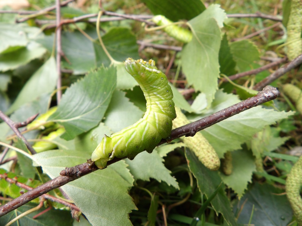The larvae are green, with subtle white stripes, and are generally excellently camouflaged as catkins – it is no suprise all their major host plants (birch, alder, hazel, hornbeam) seem to have them! To make the illusion even stronger, larvae often assume their unusual resting position, which can only be described as them bending backwards. Larvae have a small bump on their rear which could resemble the anal horn that Sphingidae typically have, causing some people to incorrectly assume it is a hawkmoth larva.