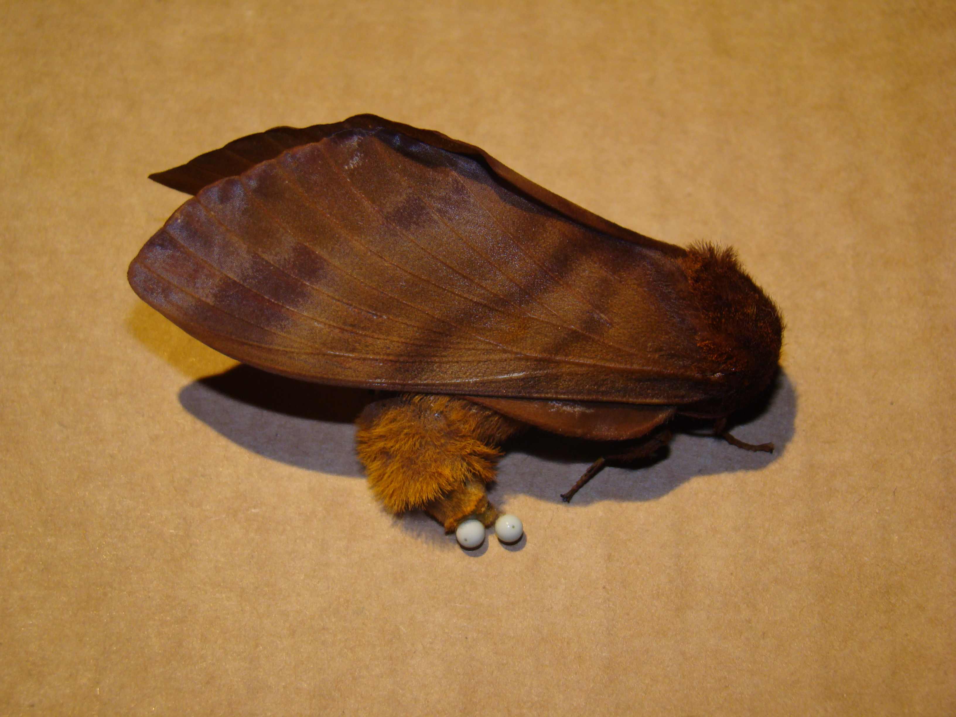 The females of Gonometa nysa are quite large and remind me of a medium sized Citheronia (Saturniidae). The females are very fat and have heavy abdomens – they don’t like to fly much for that reason unless disturbed. Instead they prefer to sit still in a good spot, where they will spend days waiting for a male to arrive. Females have a very clumsy but powerful flight; their wings make a lot of noise when they fly, buzzing almost like a heavy beetle in flight. Females have the habit of dumping their eggs if stressed out.
