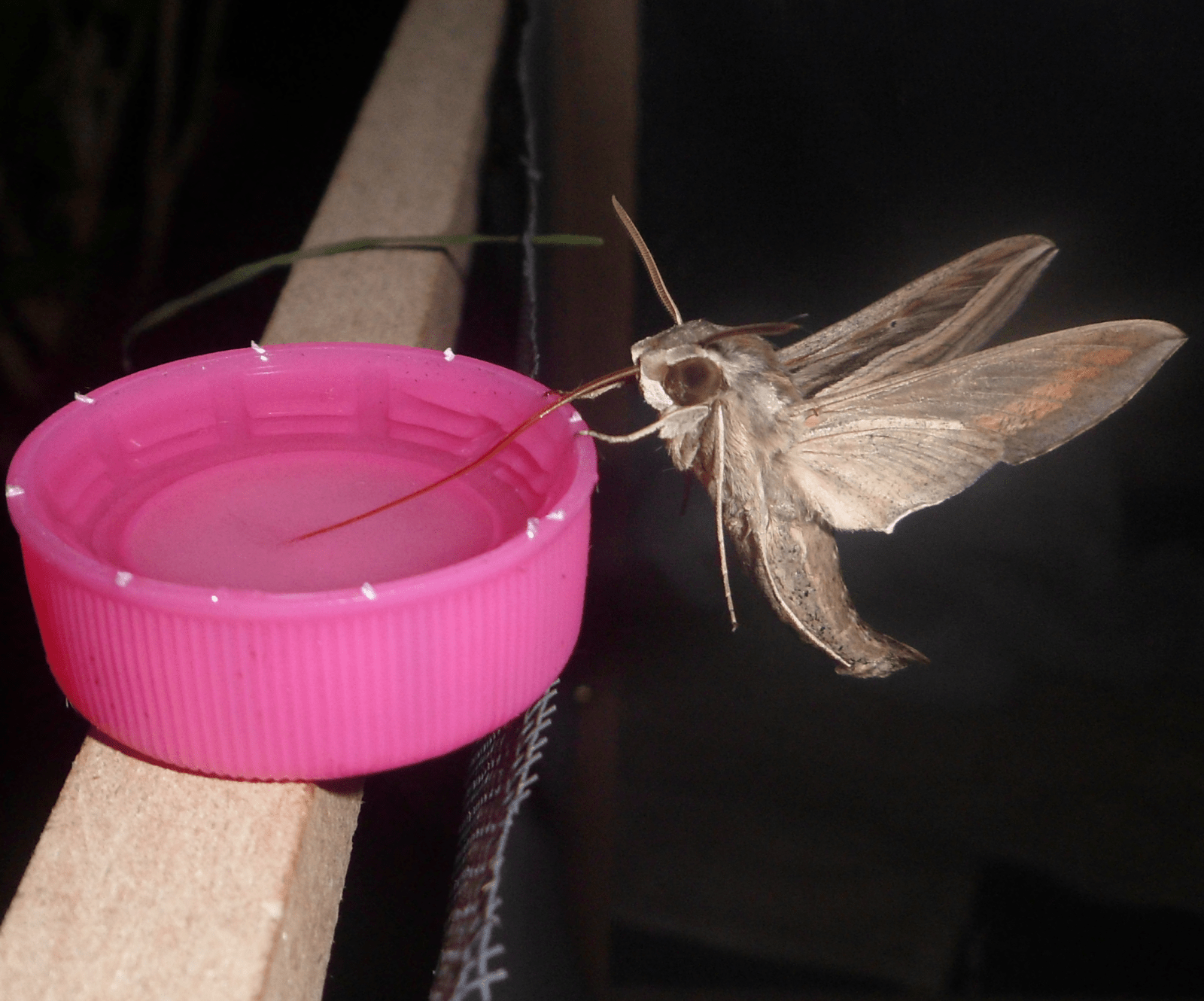 Hippotion celerio feeding in captivity from bottle caps with sugar/honey/water solutions; even better are artificial or real flowers that the moths will easily seek out.