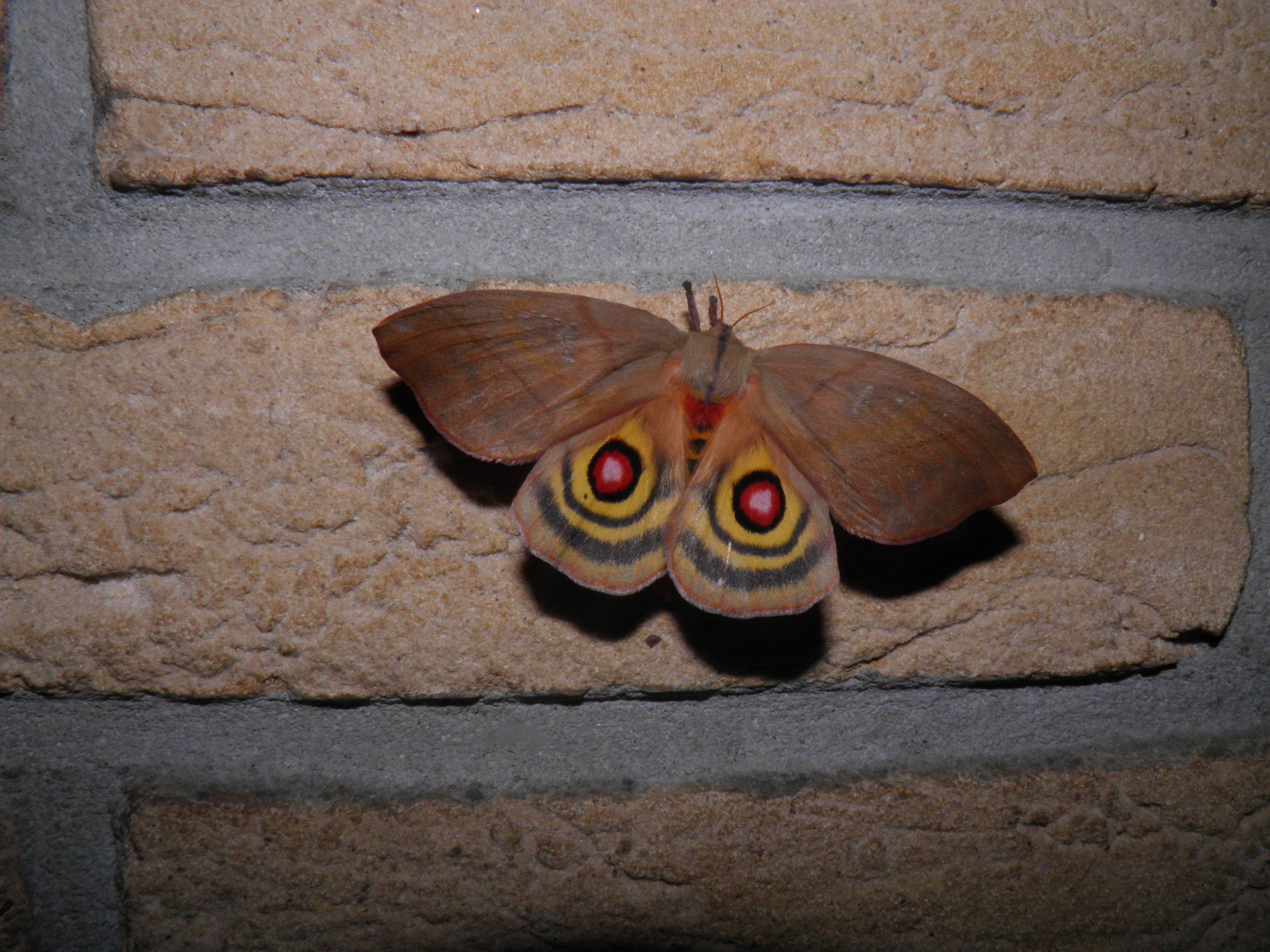 The males seem to be much smaller than the females. They are also extremely active and have a short livespan – they don’t seem to last longer than 5 to 7 days. Females last a little longer (10+ days) and are also significantly bigger. The moths are actually well-camouflaged and resemble a leaf when they cover their hindwings with their forewings in their resting position. But when disturbed they will flick their wings open in a twitching motion, revealing two red eyespots, bright enough to startle any curious or hungry animal.