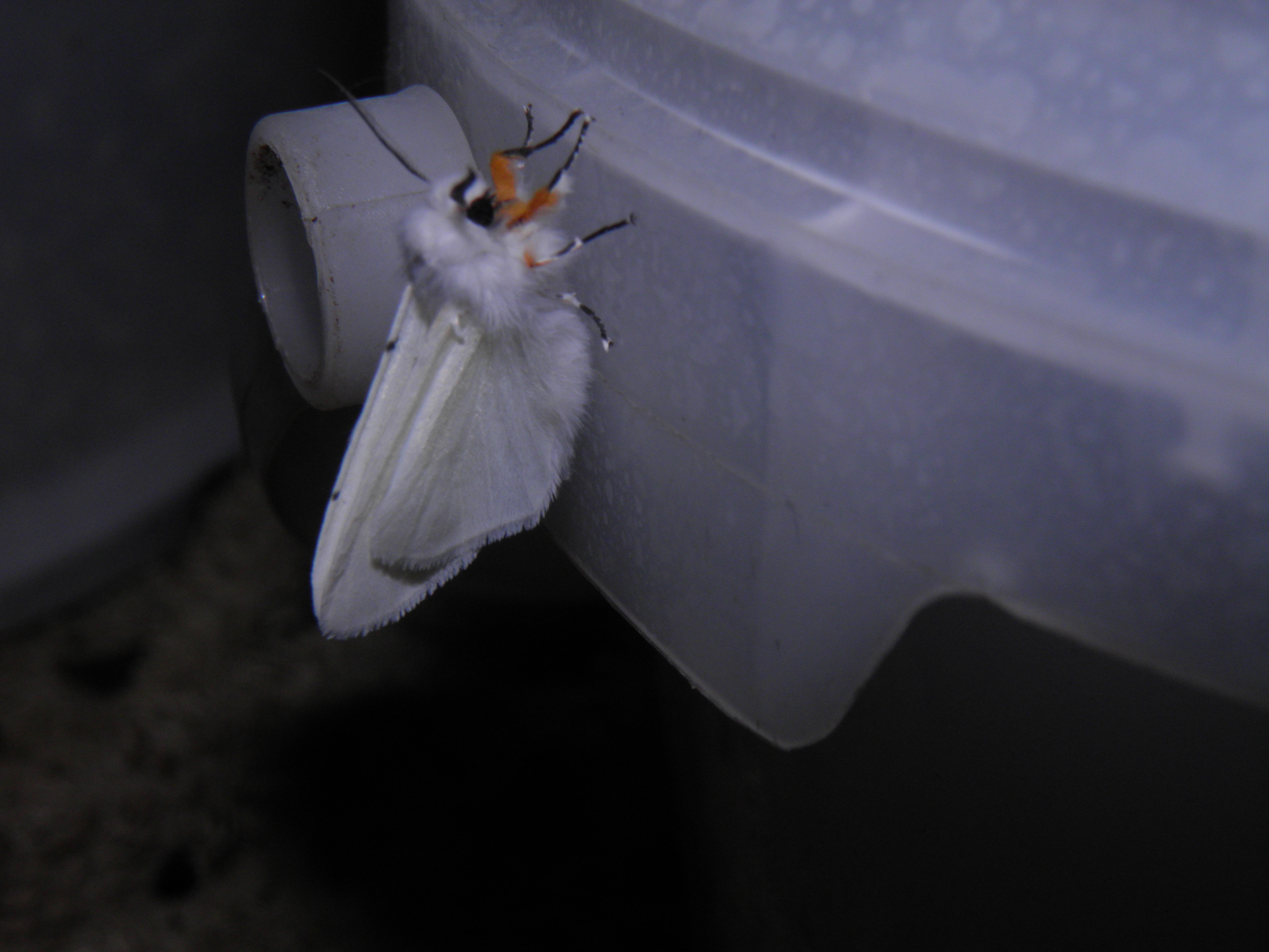 Hyphantria cunea freshly hatched from the cocoon; the bright yellow femora are visible