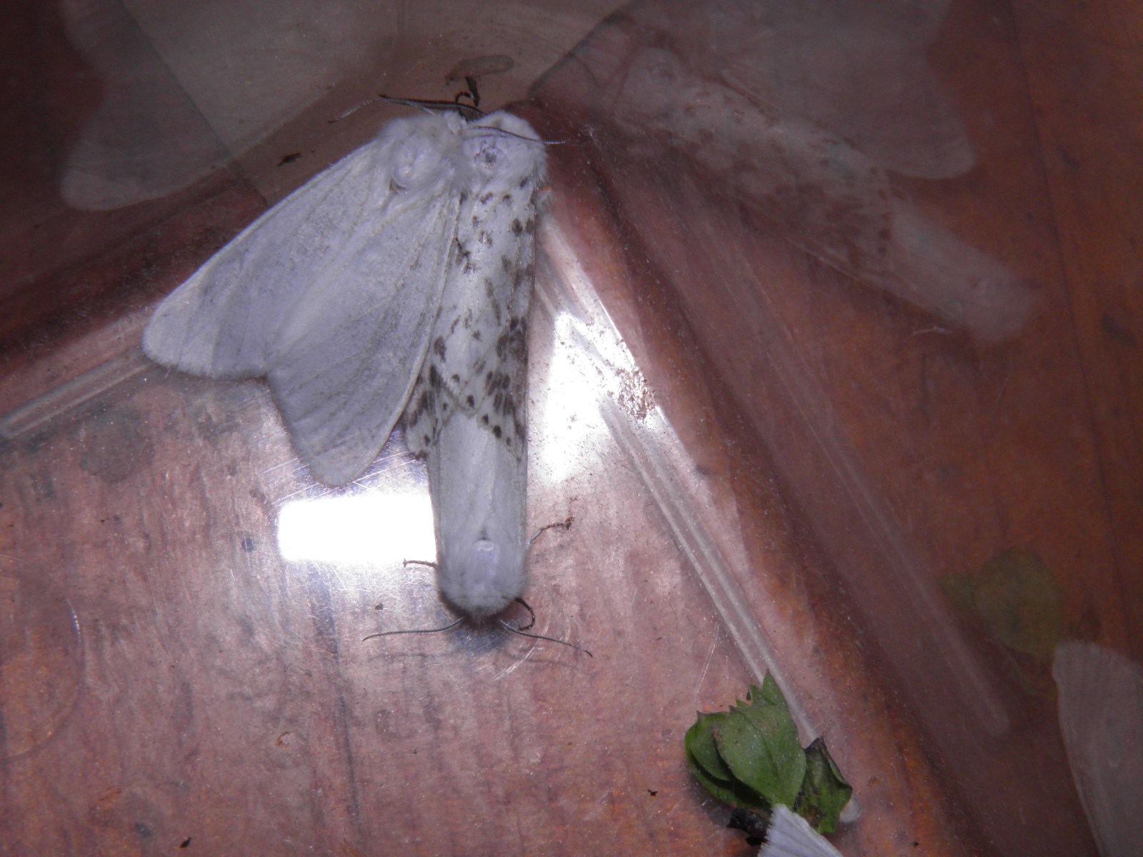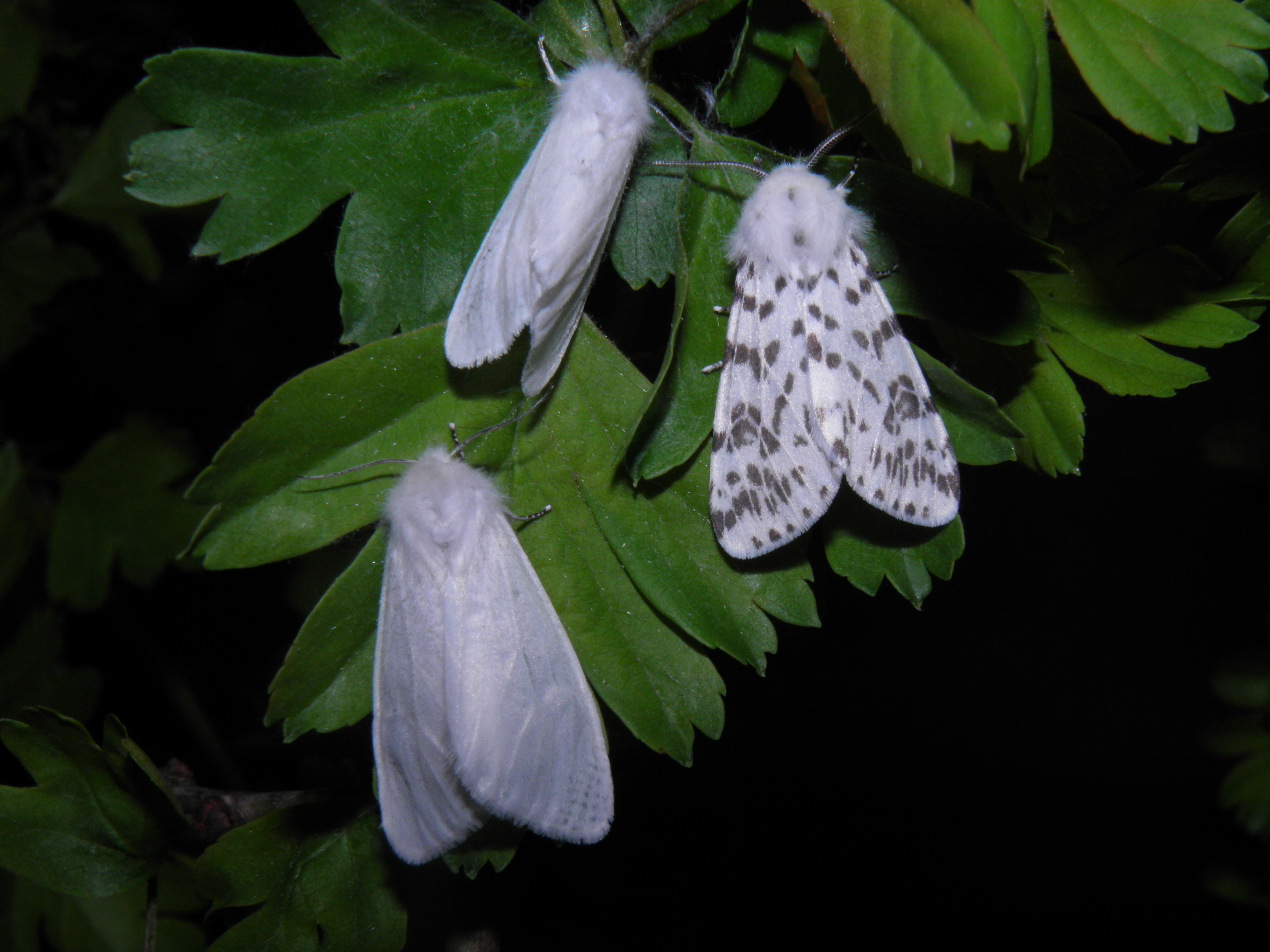 The adult moths of Hyphantria cunea have a variable appearance. The majority of them appear to be all white, except for the bright yellow femora on their legs. However, the moths also have variable black pigment. The black pigment is often expressed as seemingly random black spots and may vary from just a few hardly noticable black dots to heavy dark spots and stripes, in some cases similar in appearance to some species of Spilosoma moths. In extremely rare cases adults have been found that appear to be almost completely grey or black.