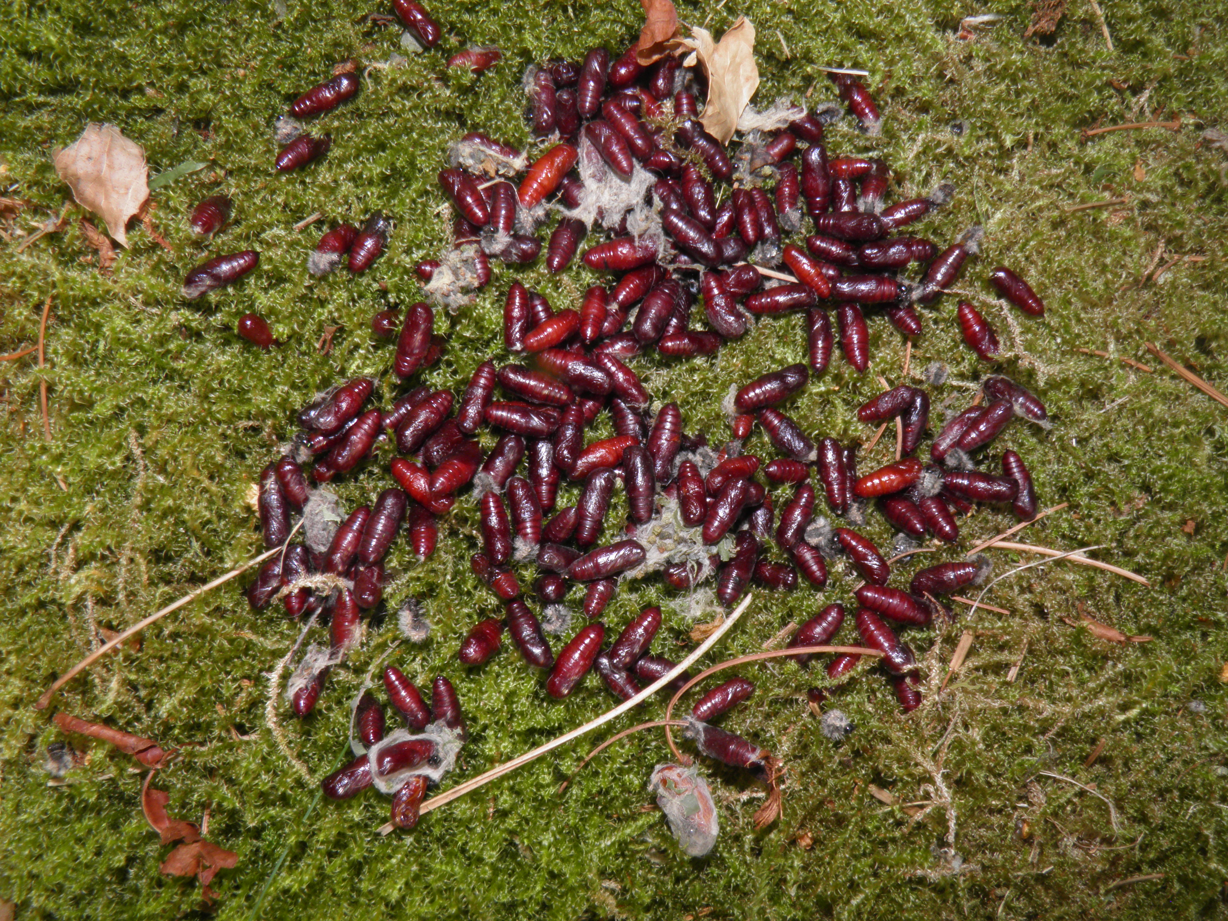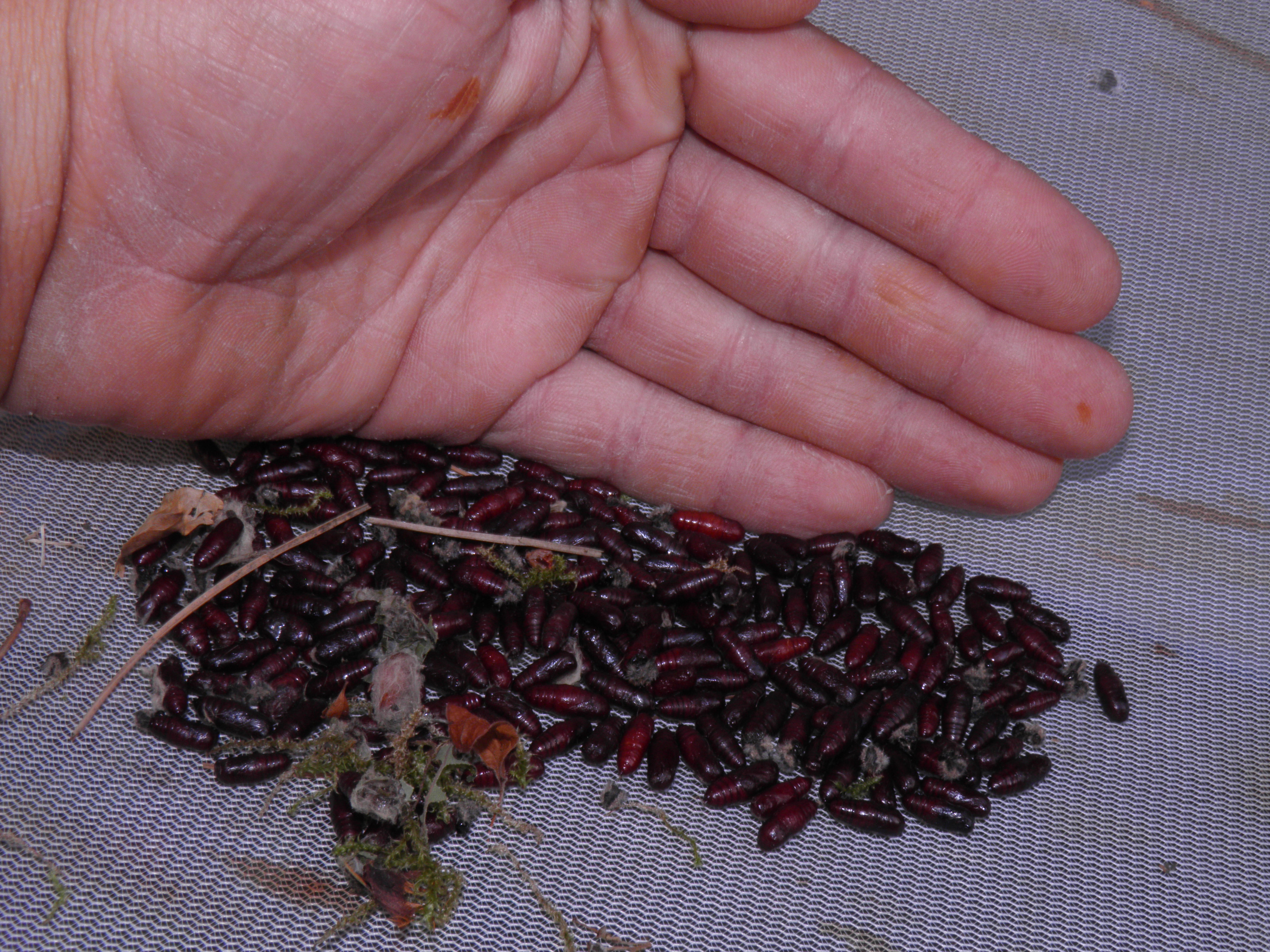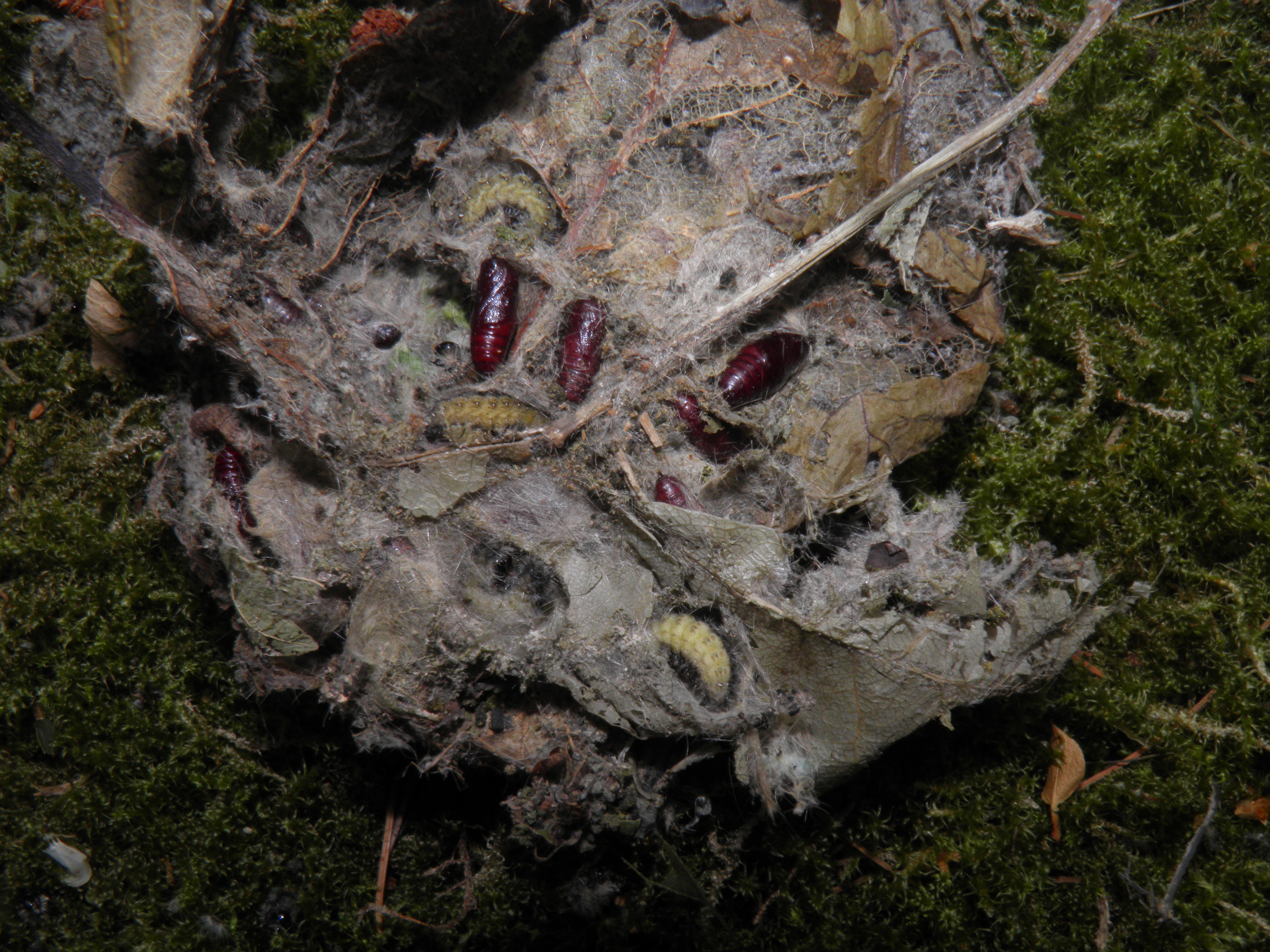 Hyphantria cunea cocoon mass including prepupal larvae and pupae produced in captivity; in the wild it is unlikely that larvae will pupate in such a high density – but for these were raised in small breeding cages, larvae tend to pick the same spots to spin their cocoons, forming an unnatural mass – so please note that is this captive behaviour only, in the wild cocoons are single and usually solitary.