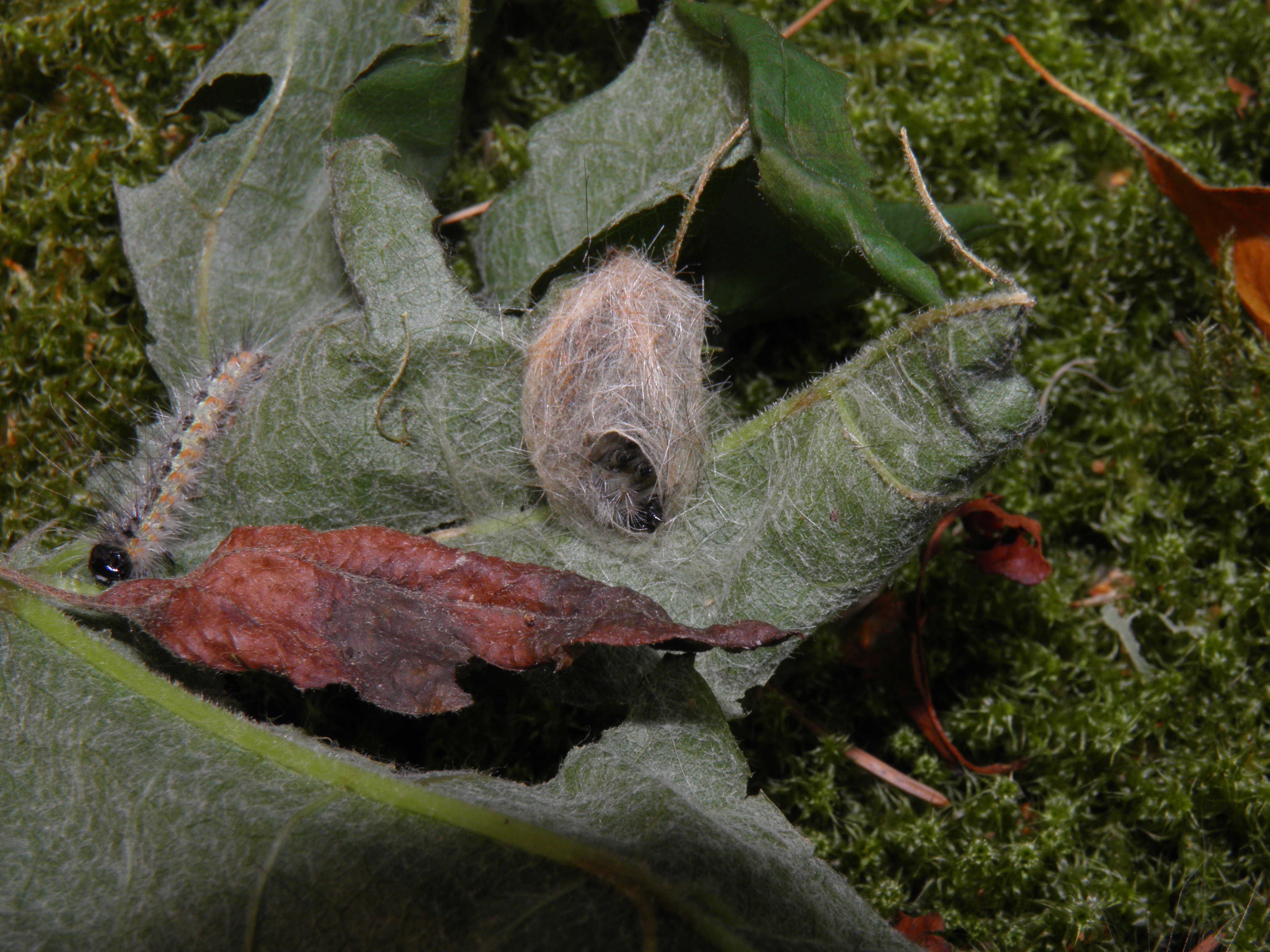 When the larvae are mature and fully fed, they descend to the floor from their respective host plants looking for a sheltered spot to spin a cocoon. This is usually done in leaf litter or against tree bark. A small percentage of larvae does not bother to build a cocoon at all, and pupates on the floor, usually within leaf litter or small crevices. When spinning cocoons, the larvae of Hyphantria cunea incorporate their body hair into the silk, forming a hairy cocoon. This protects them from the elements and allows them to overwinter, but also shelters them from certain kinds of predators. Pupae can remain dormant for an extended period of time, potentially hatching after a year. In captivity, if kept warm, they will likely produce continuous generations. The development from egg to cocoon takes about 1.5 to 2 months on room temperature, although warmer temperatures speed up the process.