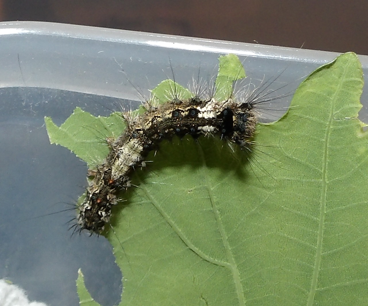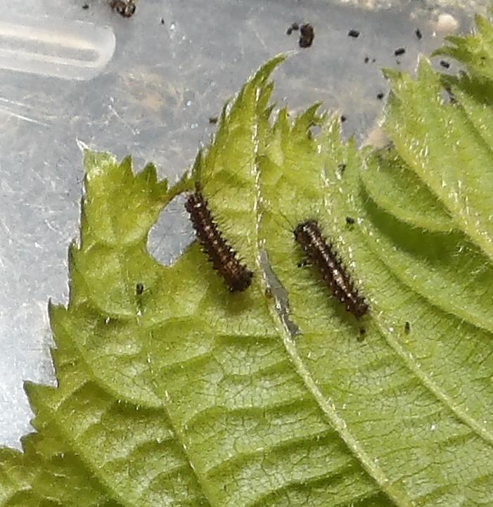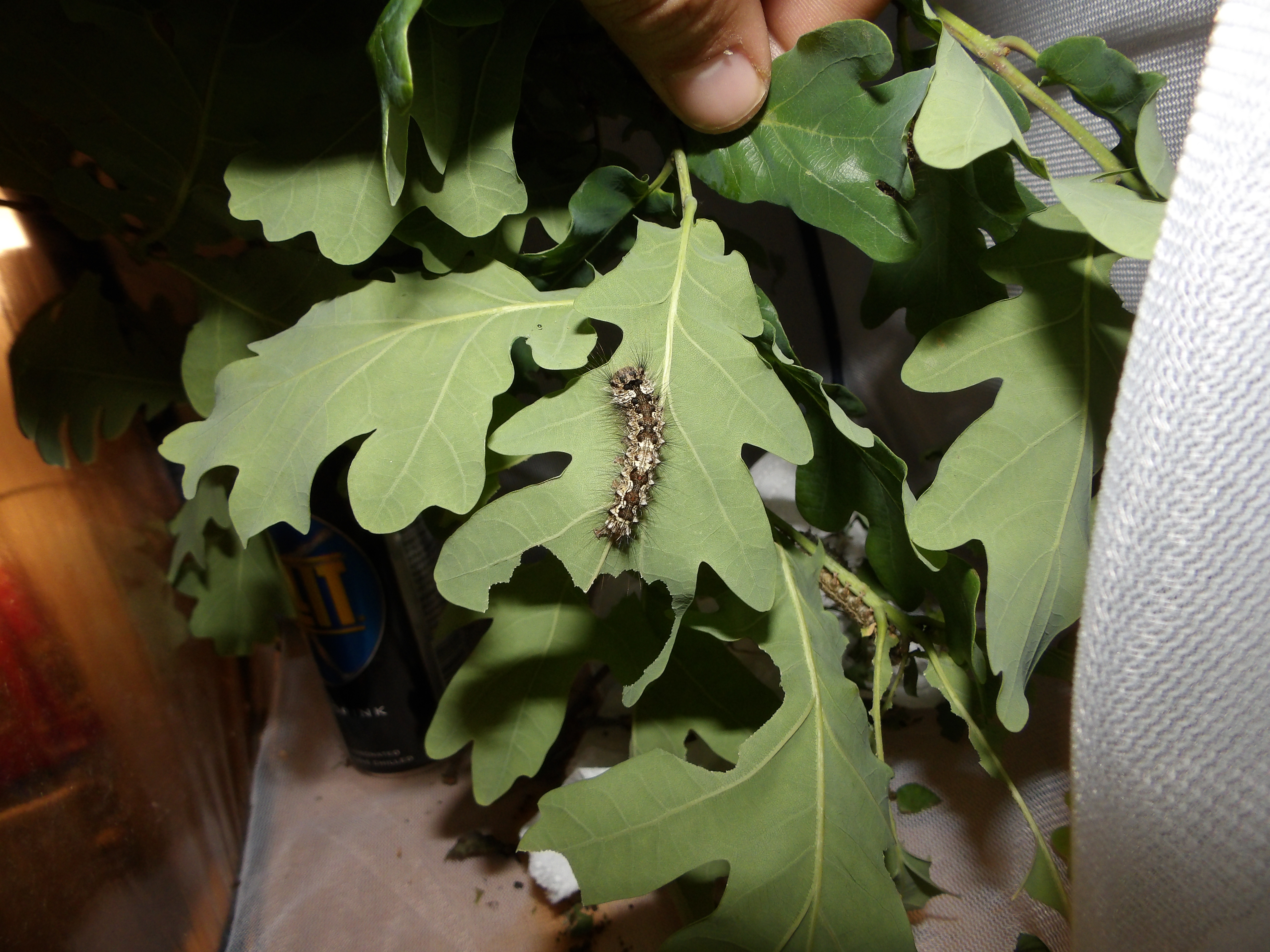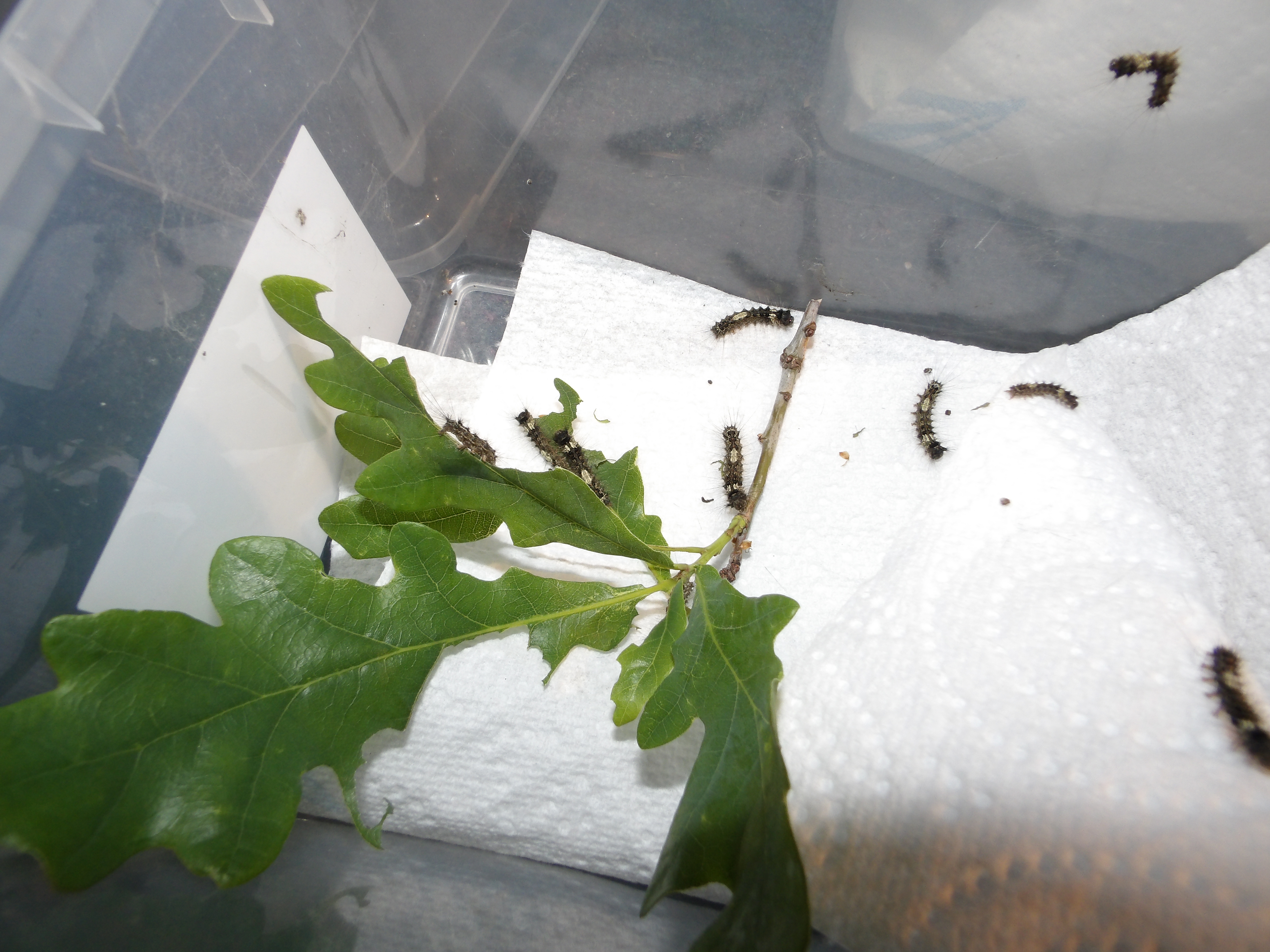 Eventually, the caterpillars will become larger, and will do better in well ventilated rearing sleeves and/or cages. It is entirely possible to raise them from egg to pupa in plastic boxes though; but ventilation and space will increase their survival rates. A cut branch of host plant can be kept fresh in a water bottle or empty soda can that is filled with water. The larger larvae tend to hide stiffly pressed against the branches or cage walls as they would in the wild; in their natural environment, they prefer to camouflage themselves on tree bark.