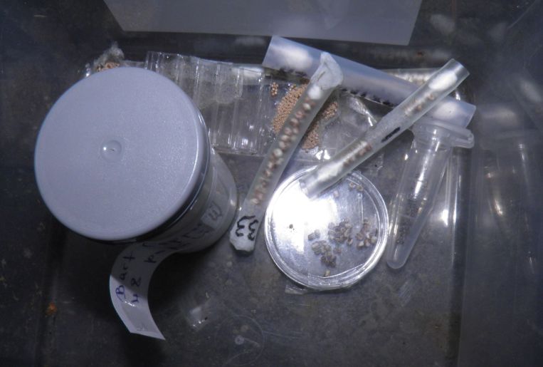 Lymantria monacha eggs overwintering in a plastic box in the garden – in the PCR tube on the right