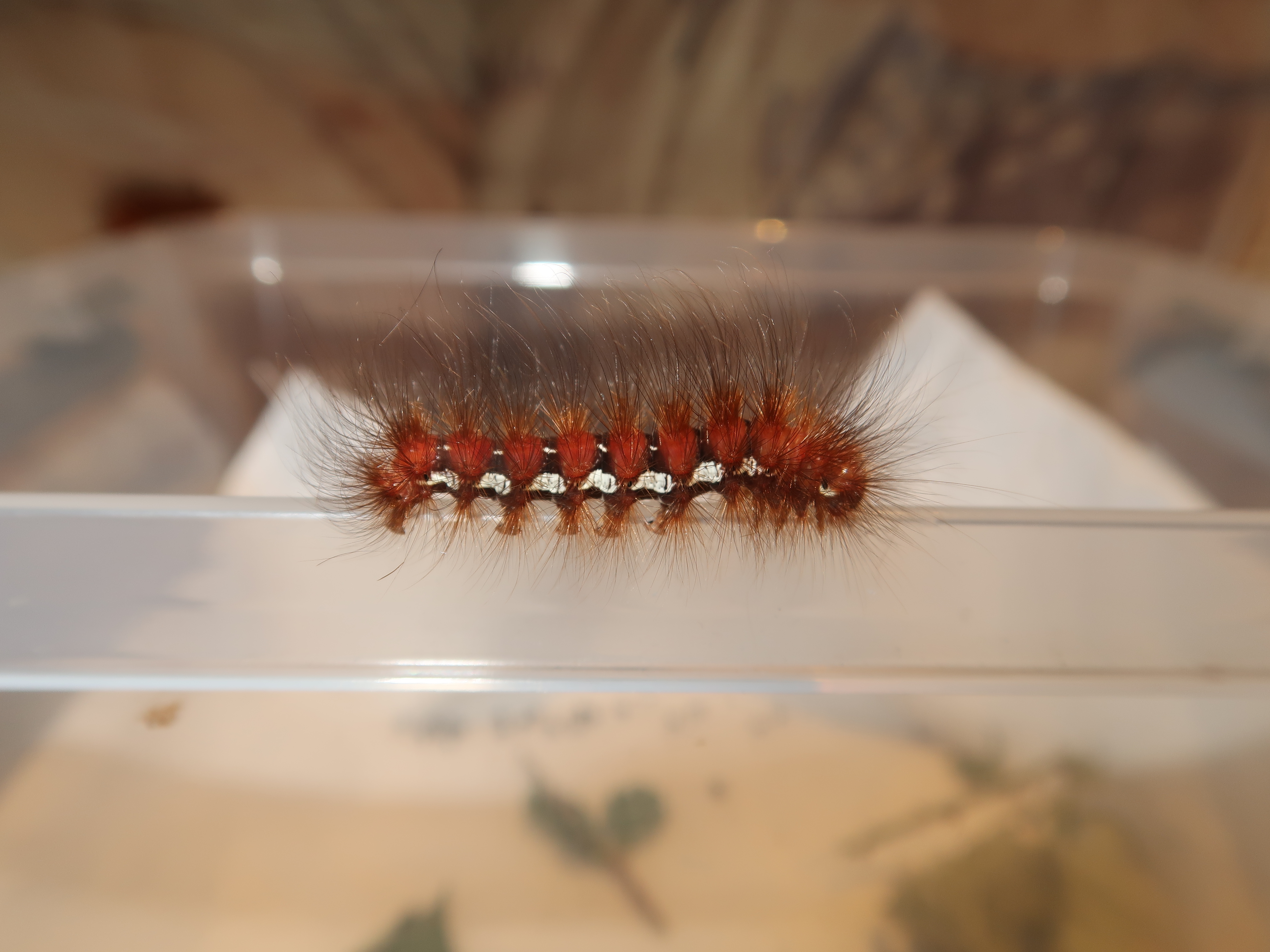 Eventually, the caterpillars grow to a size of about 3cm to 4.5cm – and become bright orange with the typical ‘tufts’ that Lymantriinae have, and a bright yellow stripe that runs alone their sides. Their hairs have a mildly urticating effect when touched.