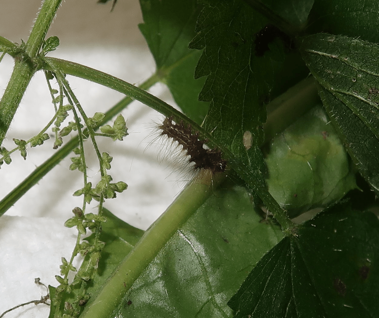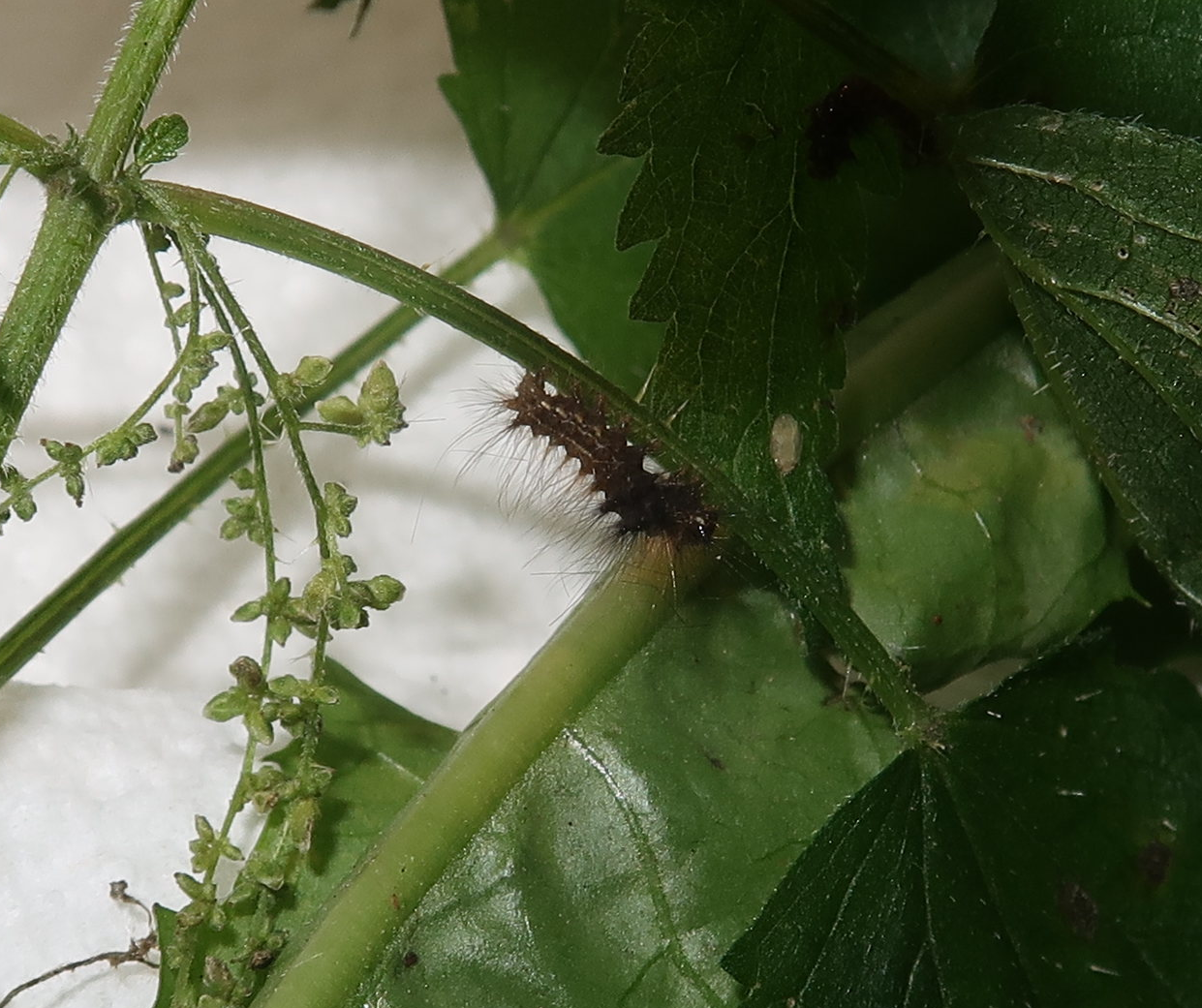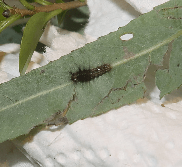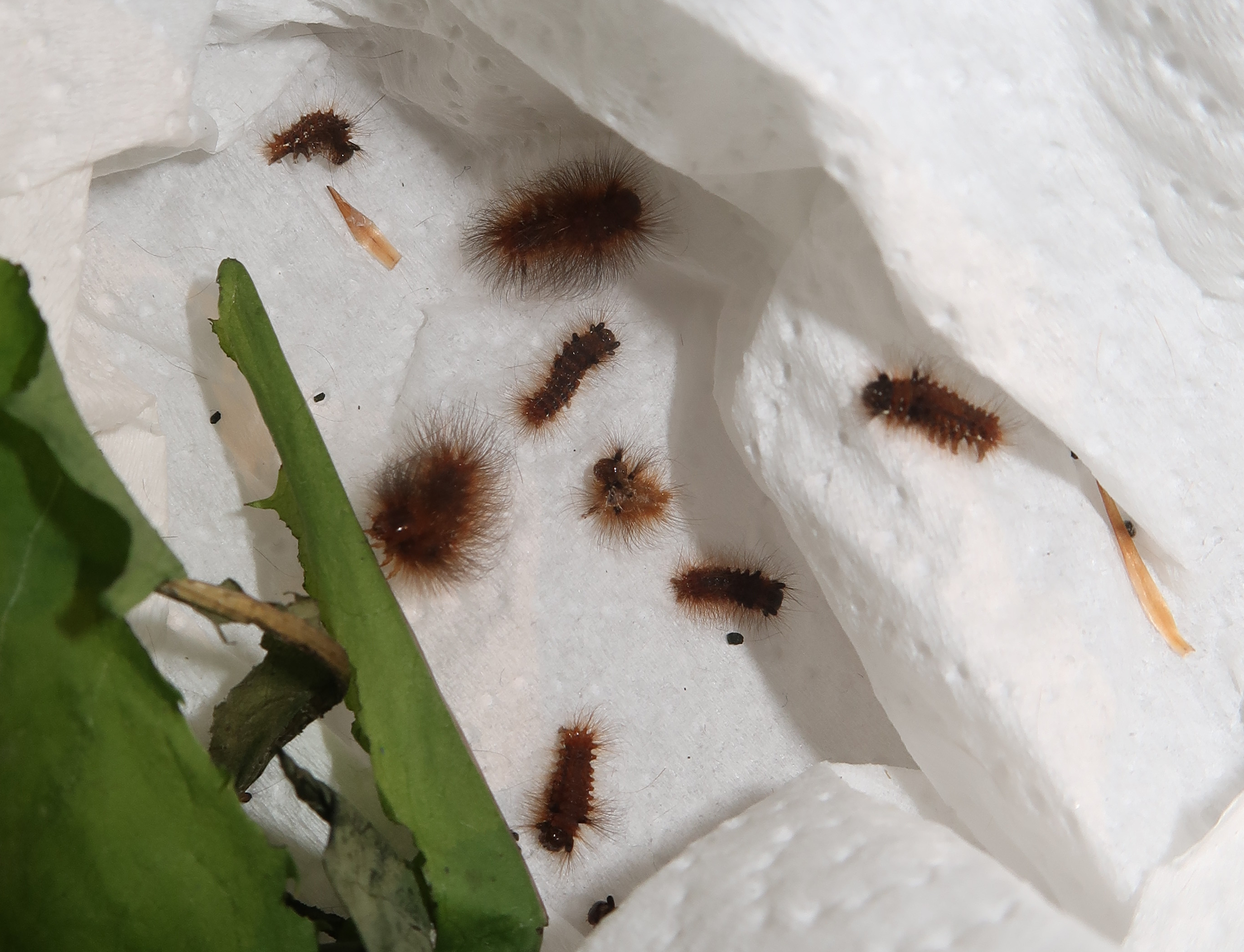 Shortly after hatching, tiny grey larvae appear. The first instar of Mylantria xanthospila has hairy tufts, a grey body with white stripes, black thorarical segments, and two protrusions near the head capsule. They can run really fast for a young first instar larva, and prefer to hide themselves under leaves, slowly feeding on them. They seemed to prefer dandelion (Taxaracum) and nettles (Urtica dioica) above most other foods. Despite literature mentioning pine tree (Pinus) as their host plant, mine seemed to totally refuse it.