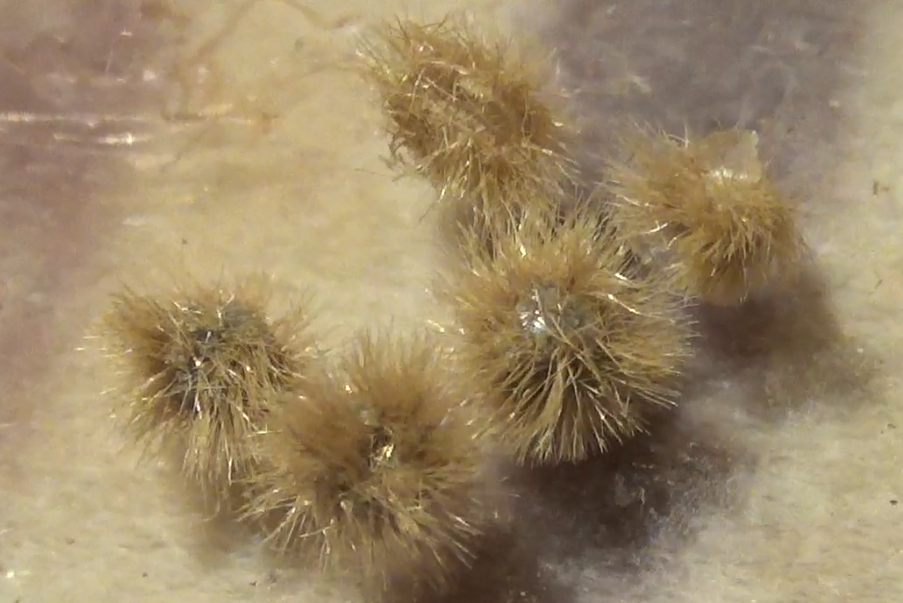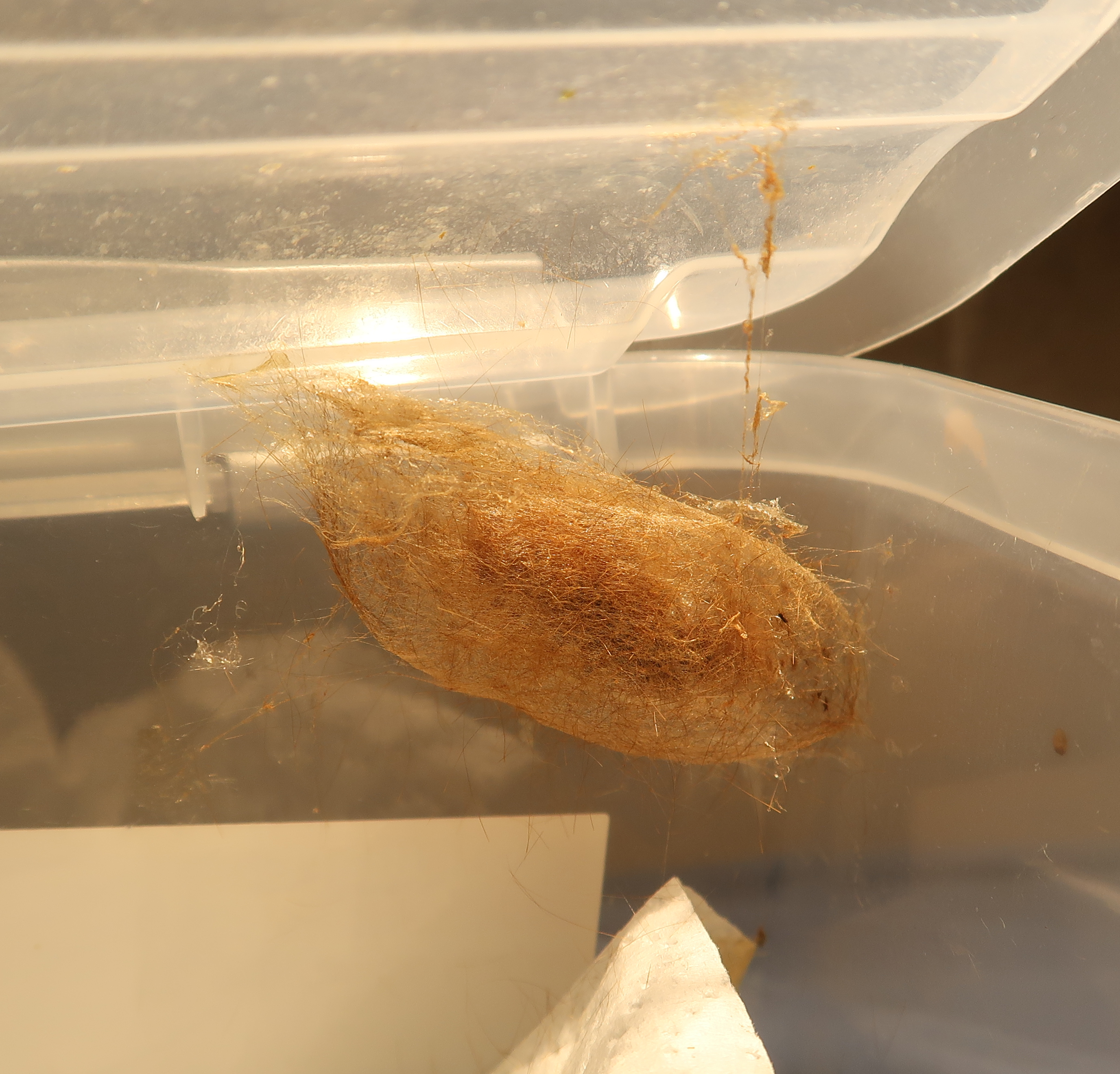 Once fully grown, the larvae spin a large cocoon/chamber made from silk and their own discarded body hairs. The cocoon appears to be somewhat double layered; the exterior consists of one large, but thin layer of silk and hairs. Inside this cocoon the larvae spin a second, smaller cocoon which envelops the pupa more tightly. While the larval stage seems to last 2 to 2.5 months, the moths hatch very swiftly – in just 2 to 4 weeks, moths hatch from their pupae. Males develop much faster than females.