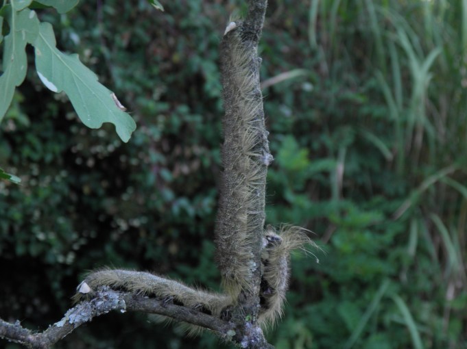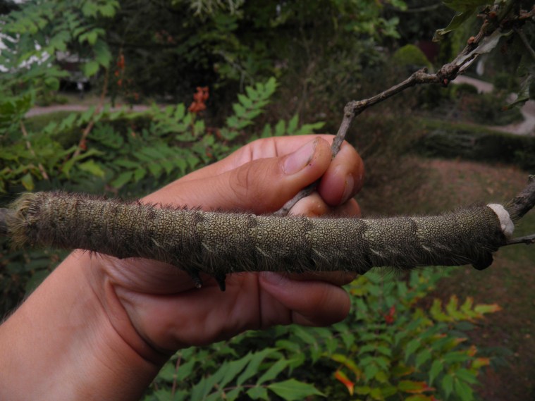 The sixth instar is very large with larvae reaching a size of about 14cm. While it looks similar to the previous instars, it is quite impressive to see how long these large, elongate larvae can become. The caterpillars that develop into males are also clearly smaller than the female larvae in this stage, for the female larvae outsize them by a few centimetres. In the sixth and final instar, the sharp spines on their bodies are very painful and may cause skin irritations, autoimmune responses and mild inflammation. I recall accidently grabbing one that was hidden on a branch of oak tree for it was so well camouflaged that I did not notice it; my hand actively hurt for a full week. Despite that, they are relatively harmless if they are not handled and by no means do they need to be touched or handled. If seriously disturbed, the caterpillars will also let go of the surface they are sitting on and fall to the floor while rolling around. To see this behaviour click here (link to a video).
