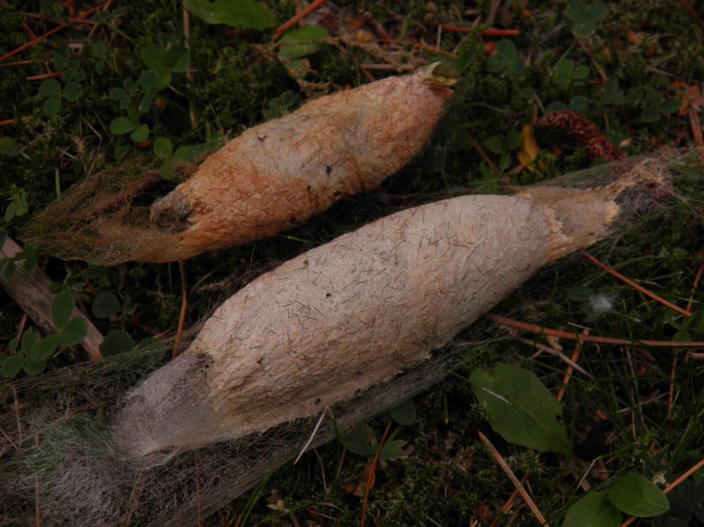 When finished, they will spin an elongated, oval cocoon make of papery thick silk with and orange/yellowish sandy colour. Interestingly the cocoons seem to have an ‘opening’ on one side that allows the moths to escape the cocoon more easily. While the opening is still sealed from the inside by a layer of silk and the cocoon is fully closed, the silk at the top of the cocoon is very thin. While the silk of the entire cocoons is overall very thick and though, this thin layer allows the moths an easier enclosure, much like an escape hatch.