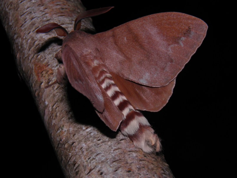 Pachymeta contraria is a great species of lappet moth found in Cameroon, Congo, Kenya, Nigeria, Tanzania and Uganda. “Great” in this context is not subjective: with a wingspan up to 150mm, it is one of the biggest Lasiocampidae. The moths appear to be uniformly (light) brown but upon closer insect they have a few very subtle white and grey patches. The most unique feature is the striped abdomen; the abdomens are white with black (female) or brown (male) stripes. This is most likely a warning pattern that scares away predators. When the moths are disturbed, they lift their wings to reveal the abdomen as a threat. While the moths are actually harmless, this tricks certain enemies into thinking they are potentially harmful creatures.