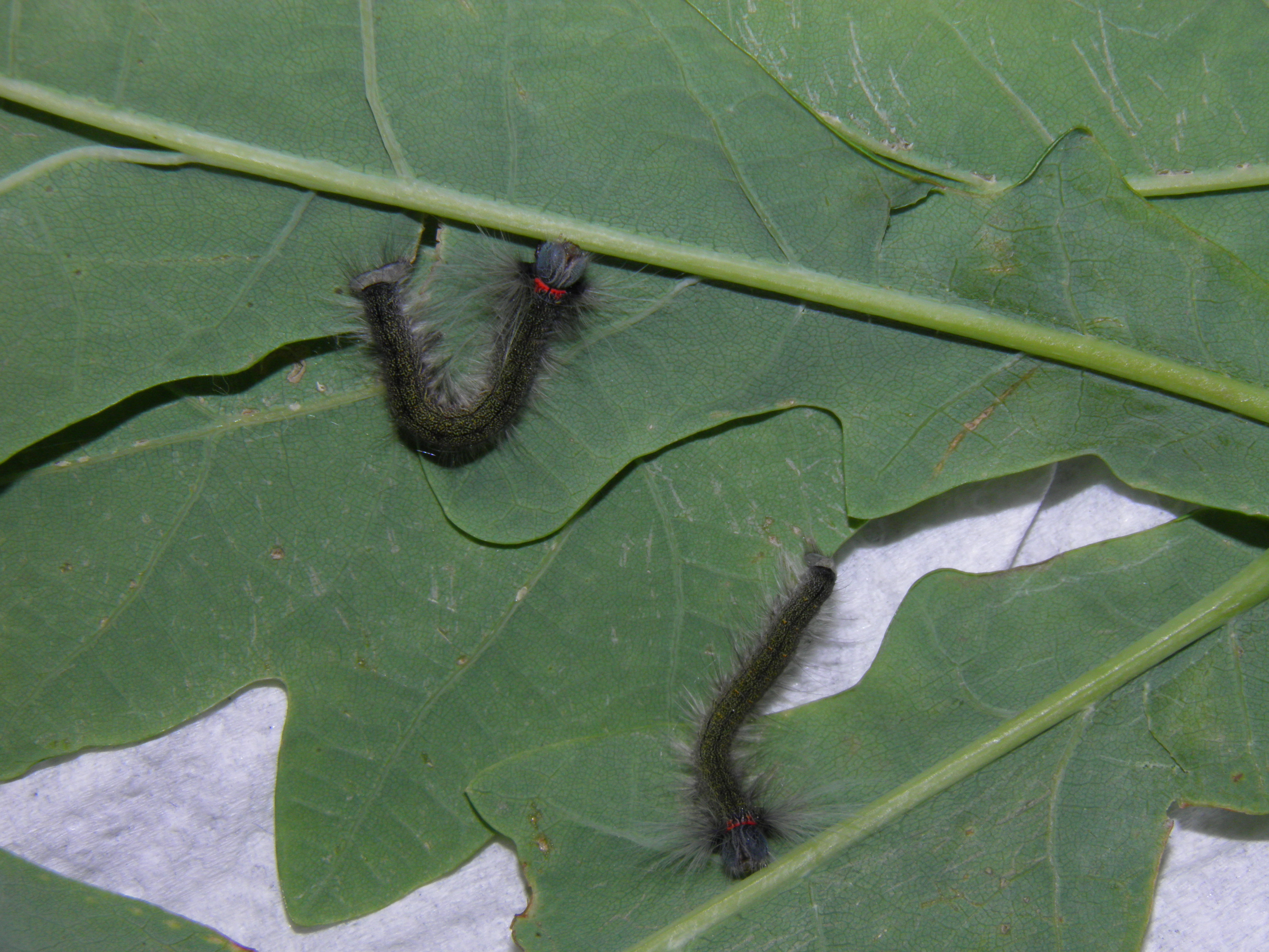 From the eggs, small white larvae with black stripes and large grey tufts hatch in a few weeks. The larvae are solitary and will wander a lot before settling down in the vegetation to start feeding on their host plants. The small caterpillars can be raised in airtight plastic containers.