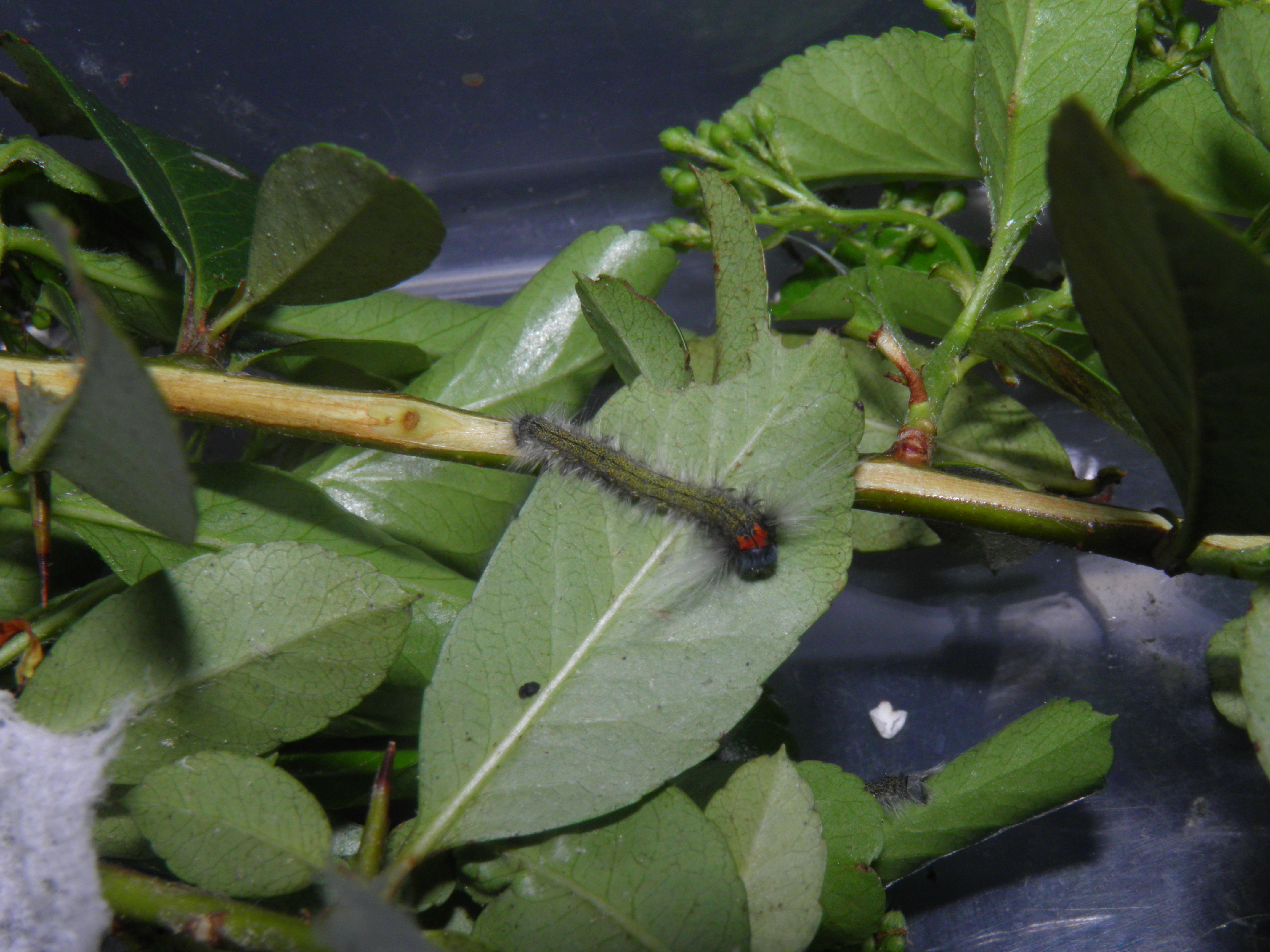 The third instar is very similar to the second instar and shows the same red markings (although reduced), blue head capsule. However, the third instar seems to be more polyphagous: they accepted Quercus (oak) and Rubus (bramble) while the first and second instar did not. Perhaps, as they mature, they become more ‘open minded’ and exihibit a higher degree of polyphagy. The first three instars can be raised in plastic boxes without much problems, they seem relatively tolerant of less ventilation and higher humidity.
