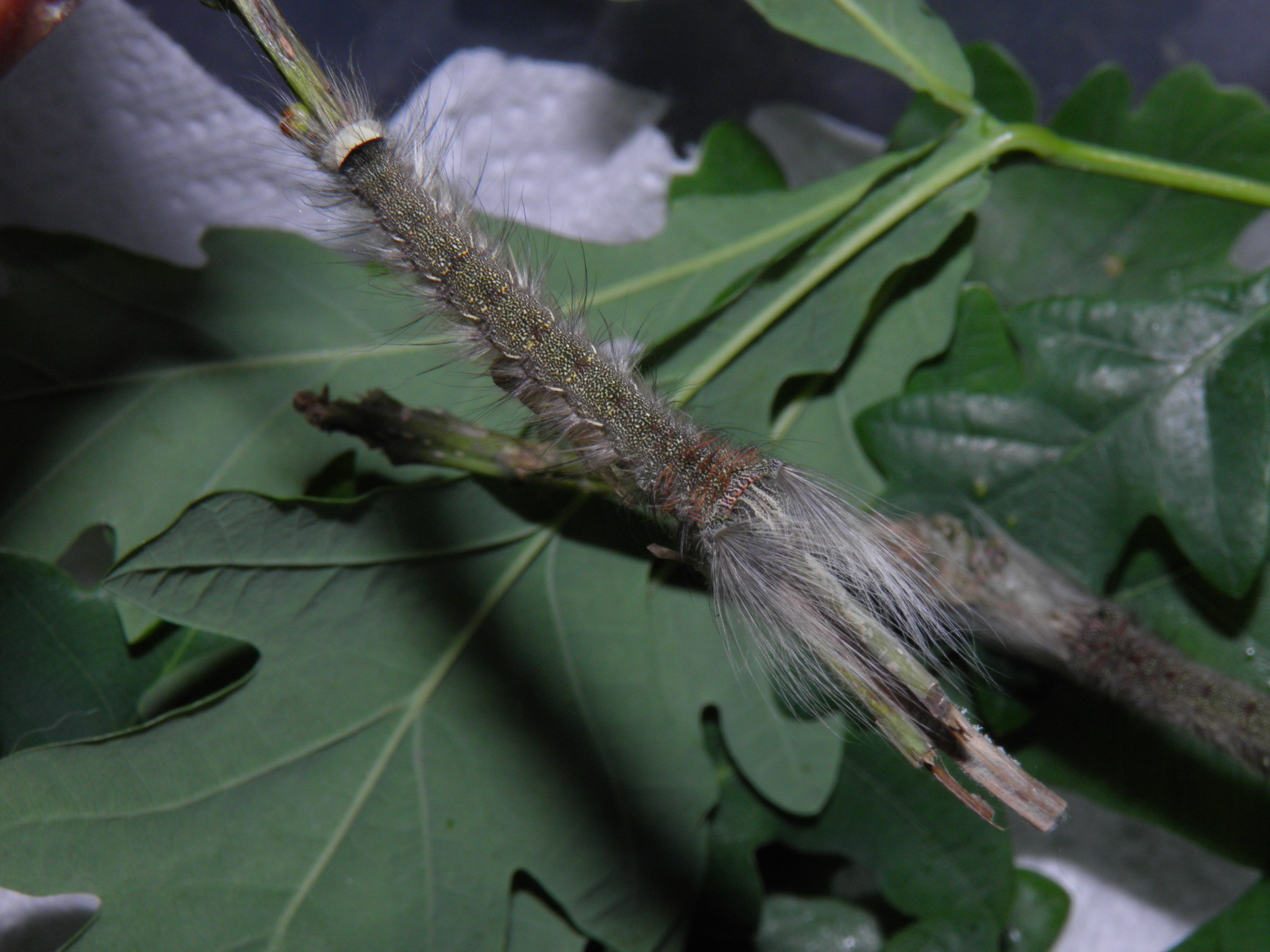 The fourth instar looks completely different. It has a creamy white body covered in grey stripes and hair, giving it an overall grey appearance; it also has large tufts next to its head capsule that it can direct forward in order to obscure its head and blend in with the surroudings.