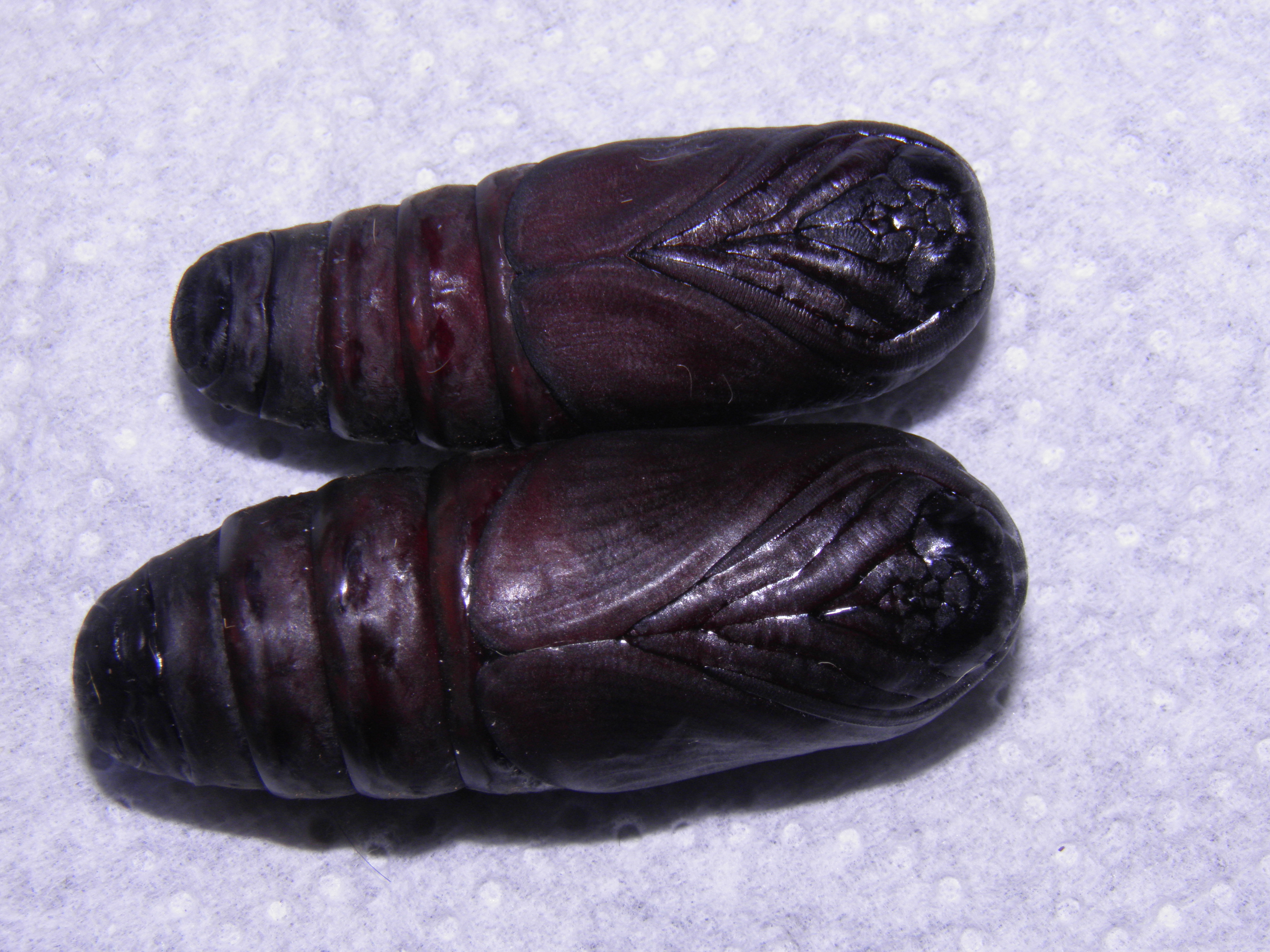Inside the cocoon, wine red pupae can be found. The female pupa is visibly bigger than the male with thinner antennae. While the pupae are normally never exposed, they were removed from their cocoons by me for photography and documentation purposes.