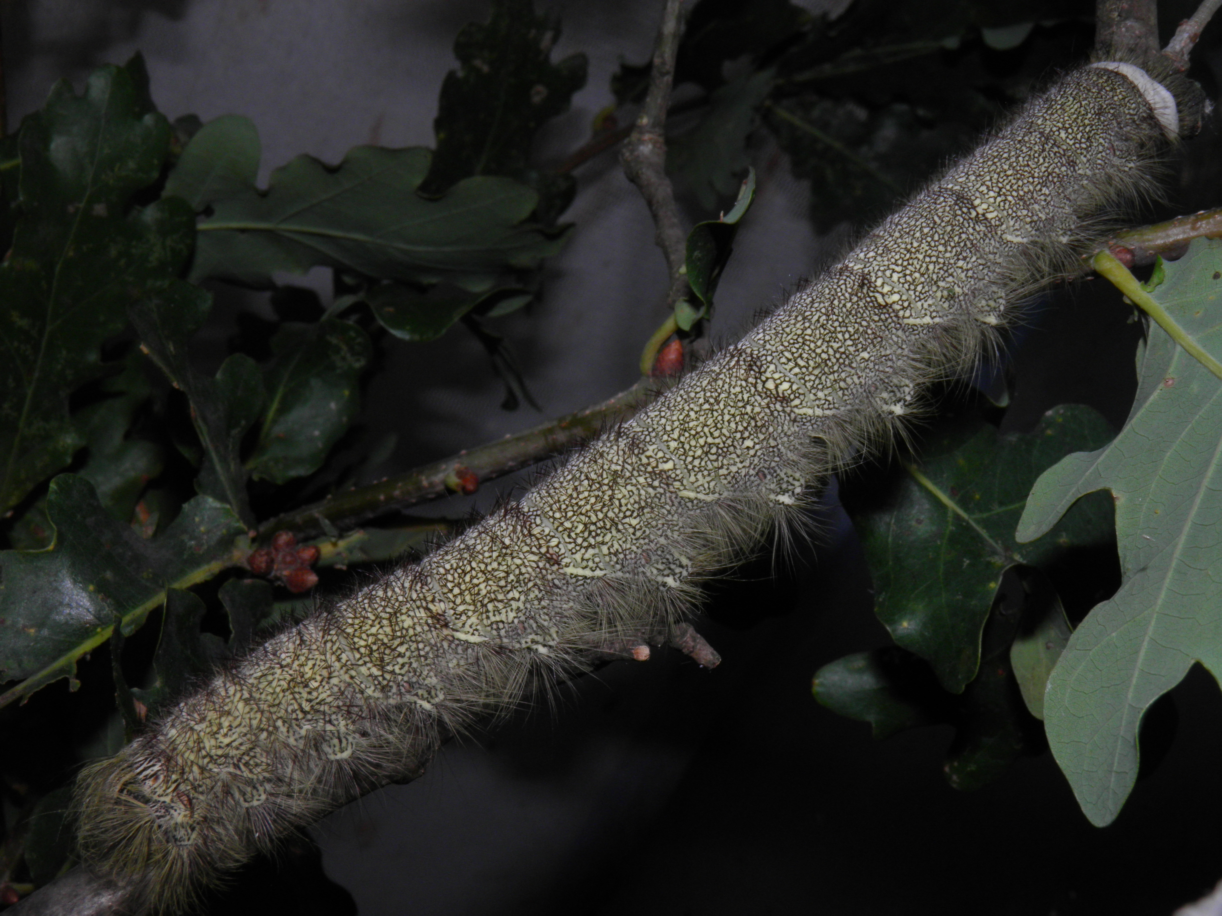 The sixth instar is very large with larvae reaching a size of about 14cm. While it looks similar to the previous instars, it is quite impressive to see how long these large, elongate larvae can become. The caterpillars that develop into males are also clearly smaller than the female larvae in this stage, for the female larvae outsize them by a few centimetres. In the sixth and final instar, the sharp spines on their bodies are very painful and may cause skin irritations, autoimmune responses and mild inflammation. I recall accidently grabbing one that was hidden on a branch of oak tree for it was so well camouflaged that I did not notice it; my hand actively hurt for a full week. Despite that, they are relatively harmless if they are not handled and by no means do they need to be touched or handled. If seriously disturbed, the caterpillars will also let go of the surface they are sitting on and fall to the floor while rolling around. To see this behaviour click here (link to a video).