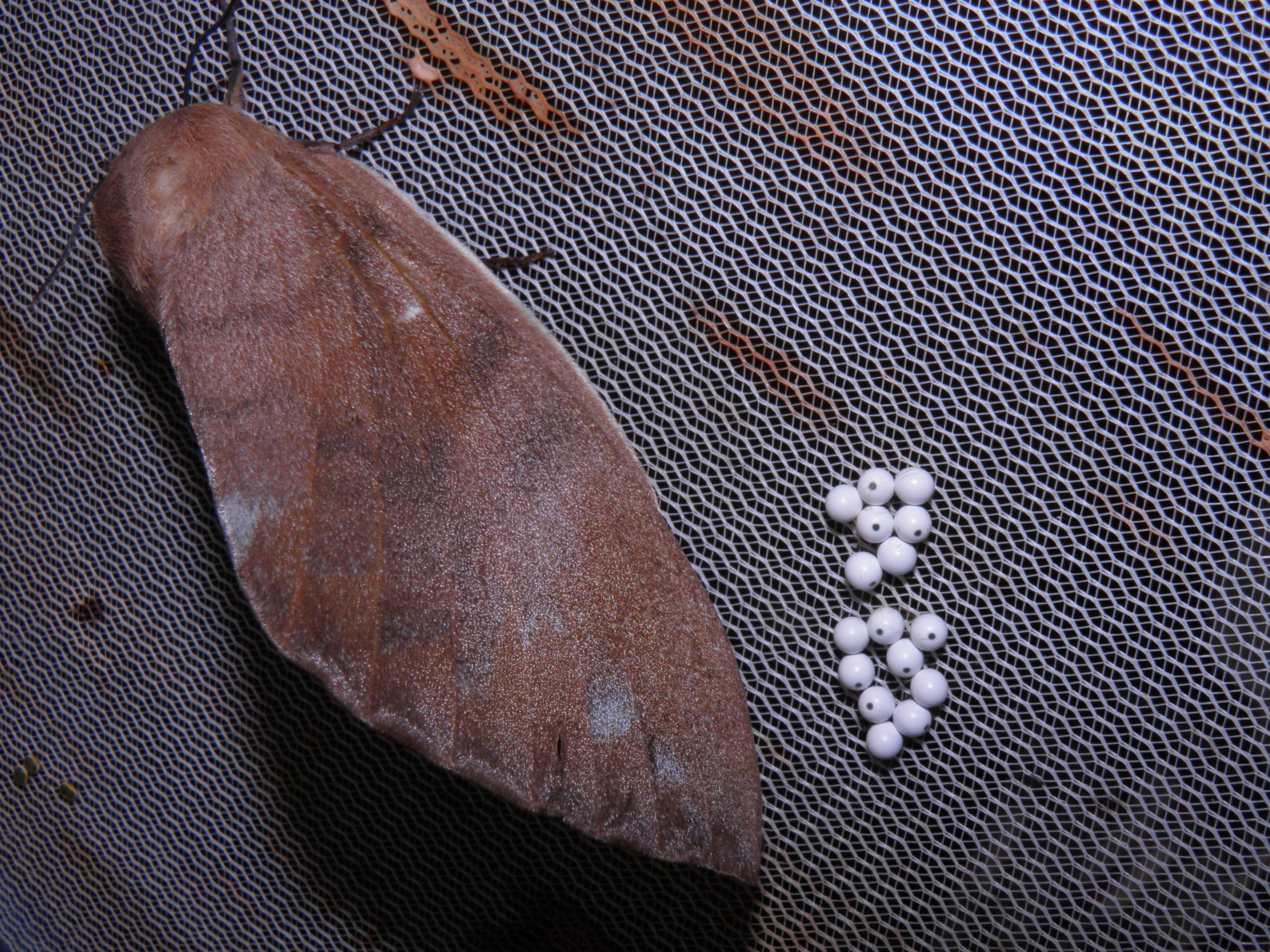 The adults are nocturnal. The females will rarely move unless disturbed, but males will be very active at night and seek out the females by smell (pheromone). They can be paired in net cages (aerariums) in warm breezy conditions. Females will become more active and restless after pairing and start laying a lot of eggs. Adult moths of neither sex are able to feed and have a lifespan of about 6 to 14 days.