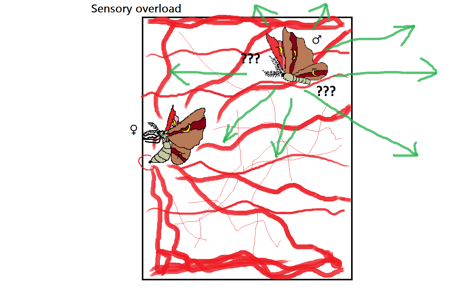 The pheromone plume is an important concept. Pheromones don’t just randomly diffuse; that would make it hard for a male to pinpoint a location. Instead, pheromones are carried by the wind. The female does not constantly release pheromone usually: in most cases, she releases them in short intervals of time. This is what allows males to estimate the distance between him and her. As they are carried by the wind, the wafts of pheromone are dispersed and stretched out, increasing the distance between the molecules. The further away the male is removed from the female, the more noticable these intervals become to his antennae. This grants the males the ability to judge if they are moving away from, or instead, are getting closer to the source. Usually they are seen flying in a zig-zag like pattern against the wind, trying to pick up the trail of pheromones, tracing it back to its origin.