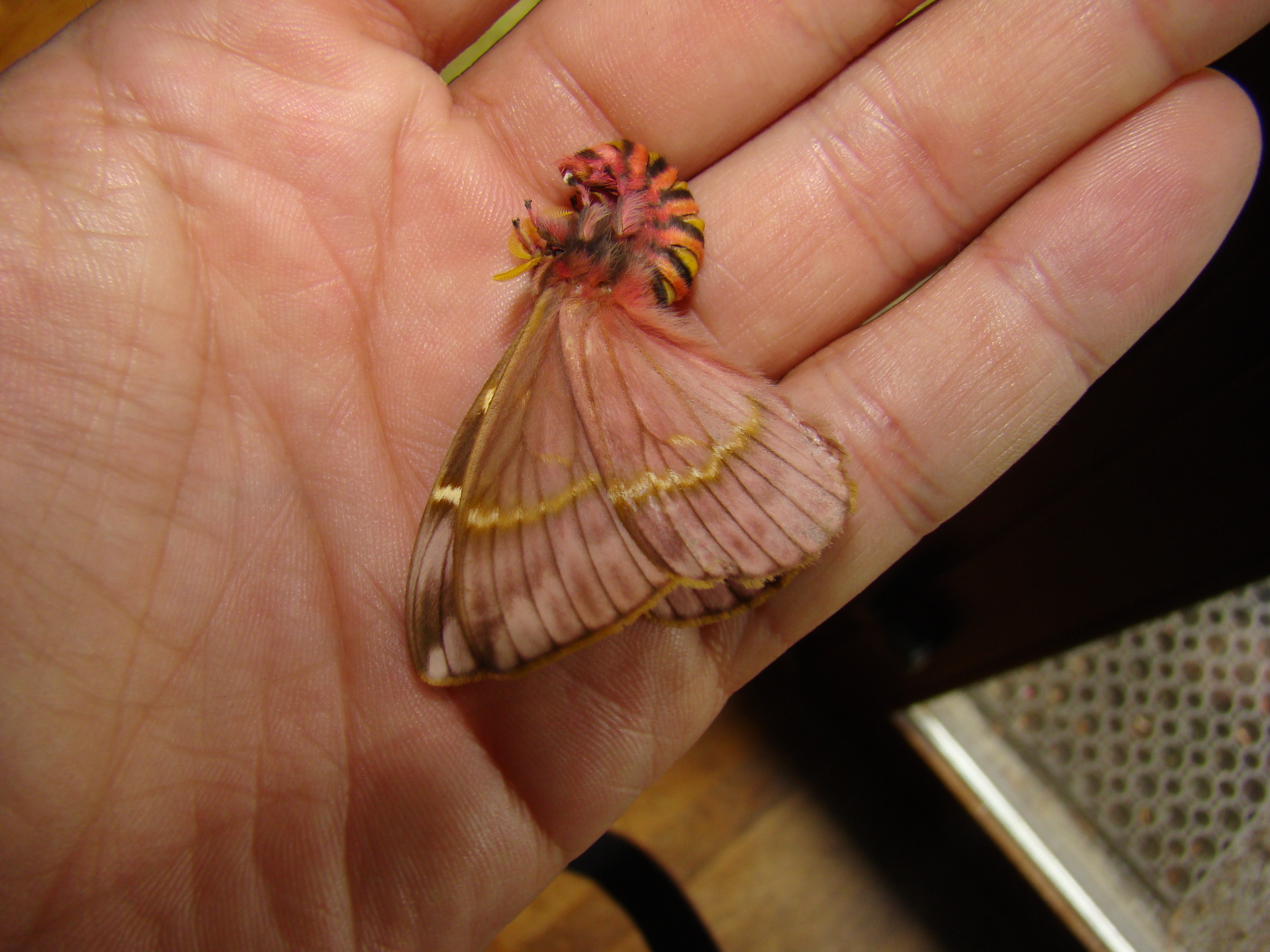 The good news is that Paradirphia semirosea is easily reared in captivity. The larvae are gregarious like many species of Hemileucinae, although in the final instar they become solitary and will need a little bit more space for themselves, although they still tolerate living in a high density of larvae. They do grow a little slowly, but that shouldn’t be a problem. Important is not to keep them wet. I reared them in plastic boxes though they should do even better in cages. The caterpillars are venomous like may other silkmoths in the Hemileucinae subfamily. Eggs hatch in a few weeks and the young caterpillars will feed on Fabaceae or Fagaceae such as Robinia, Gleditisia or Fagus, Quercus – and will also accept some Rosaceae such as cherry (Prunus). They may be more polyphagous than we think.