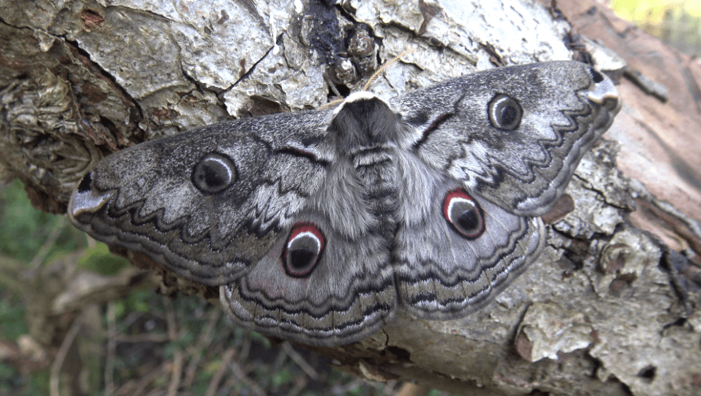 Rinaca (Caligula) lindia is one of the prettier members of the genus; their wings predominantly being pale grey with two large contrasting red eyespots on their hindwings.