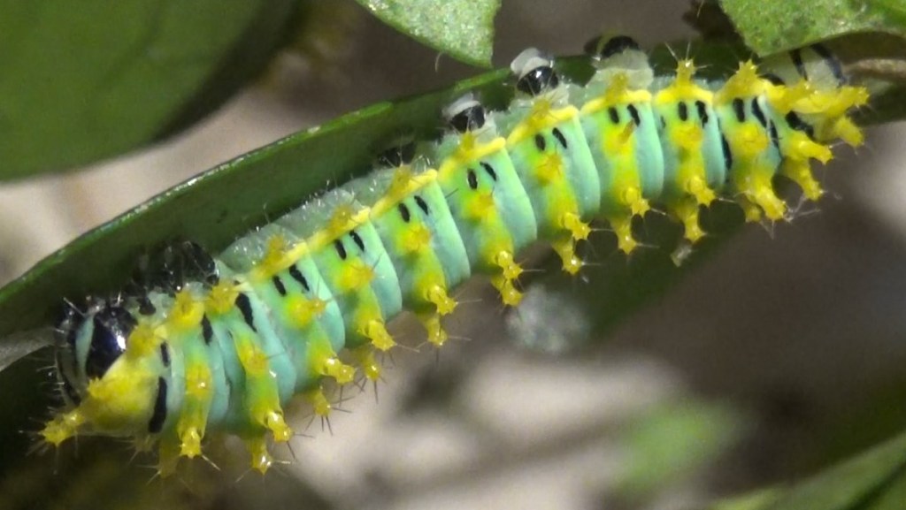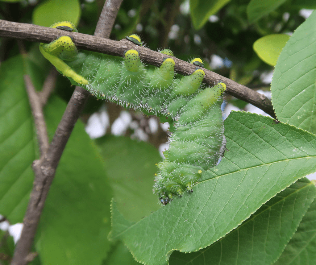 The larvae of Rothschildia triloba are just as impressive as the moths. While their backs are bright neon green with small orange tubercules, their stomachs are dark green, and covered with white fuzzy hairs.