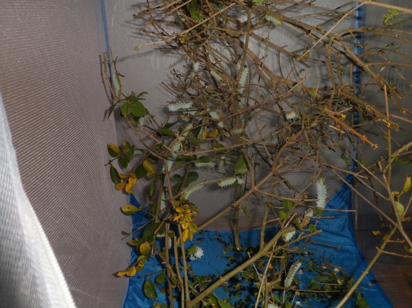 Finally, when the caterpillars are fully grown they will find a sheltered spot to settle down and pupate.  Usually they choose to settle in a corner of their enclosure. Here they spin thick white cocoons. In some cases they even spin multiple cocoons together because larvae tend to have the same preferences and choose the same places in a cage to spin a cocoon; plus the fact they  like the texture of silk to settle upon. They may also incorporate material such as leaves into their silk and  decide to spin among leaves or leaf litter.