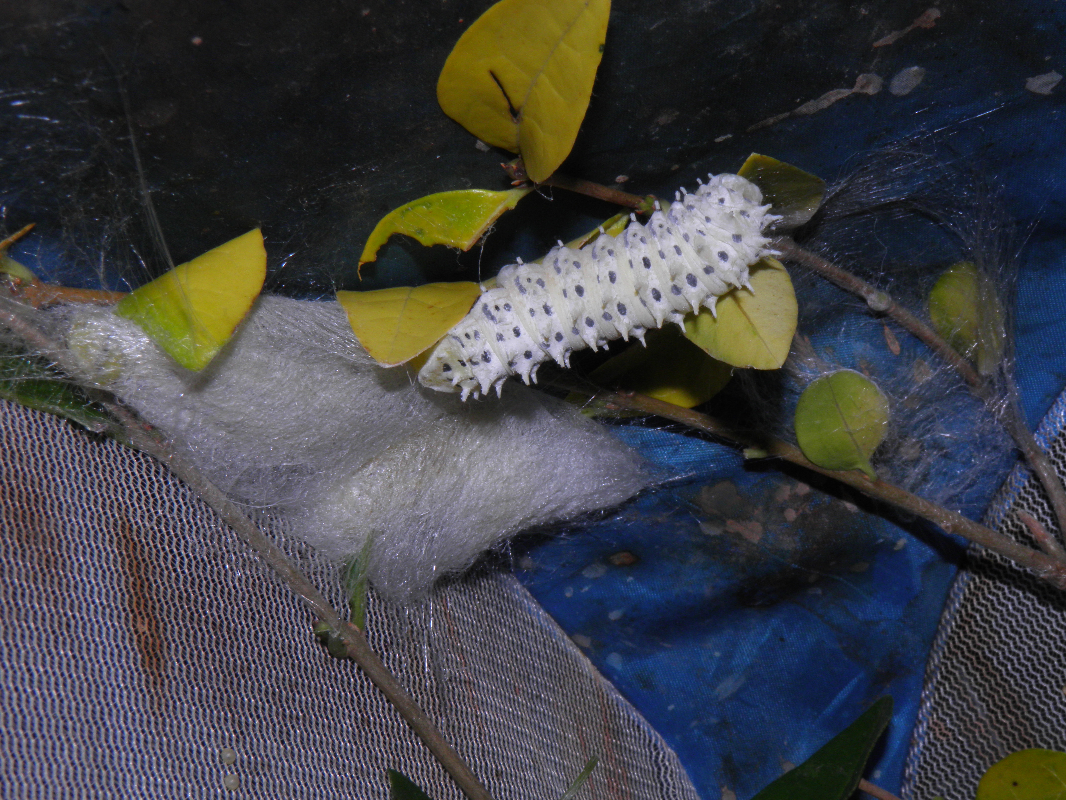 Samia ricini can be sustainably bred in great numbers. The final instar larvae will go through a lot of plant material before maturing and spinning a cocoon.